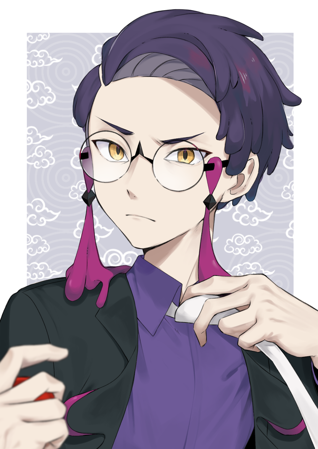 1boy adjusting_clothes adjusting_necktie black-framed_eyewear black_hair black_jacket blurry blurry_foreground closed_mouth collared_shirt commentary_request corbeau_(pokemon) glasses grey_background harutao_(mecz5525) highres holding holding_poke_ball jacket looking_at_viewer male_focus necktie nintendo open_clothes open_jacket poke_ball pokemon pokemon_legends:_z-a shirt short_hair solo upper_body white_necktie yellow_eyes