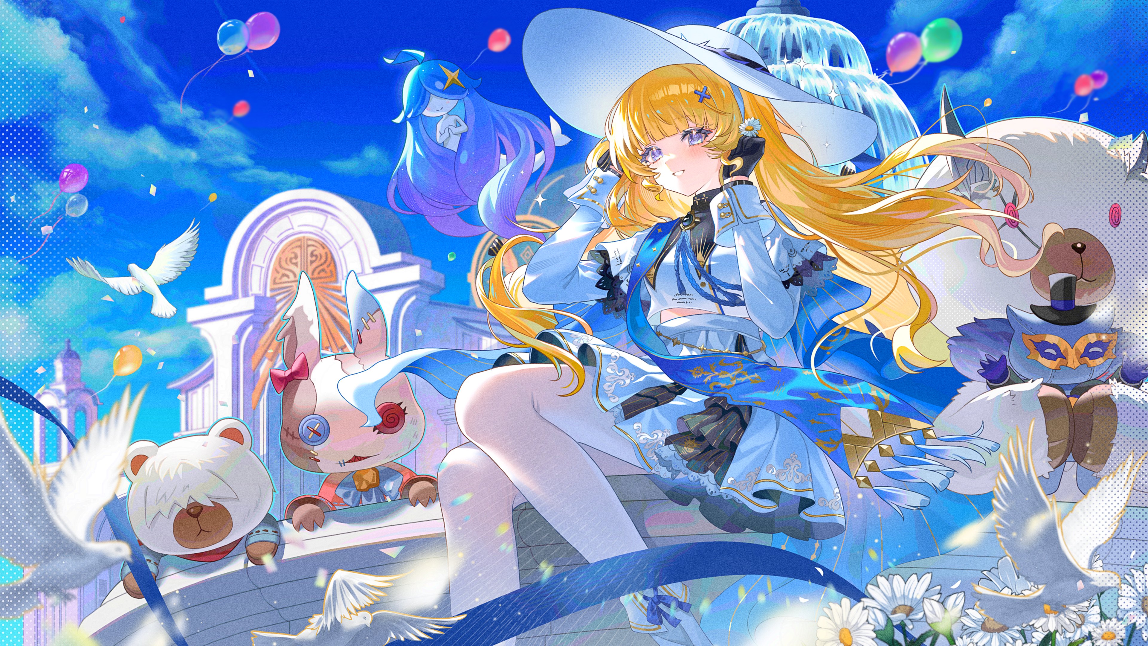 1girl absurdres balloon bird black_collar black_gloves blonde_hair blue_eyes blue_sash boat character_request check_character collar commentary_request cuddle_wuddle_(wuthering_waves) diggy_duggy_(wuthering_waves) dove flower fountain from_below gloves hair_ornament hat highres hocus_pocus_(wuthering_waves) long_hair lottie_lost_(wuthering_waves) outdoors pantyhose phoebe_(wuthering_waves) sash sitting skirt sky solo tacet_discord_(wuthering_waves) tangdou0402 water watercraft white_hat white_pantyhose white_skirt wuthering_waves x_hair_ornament