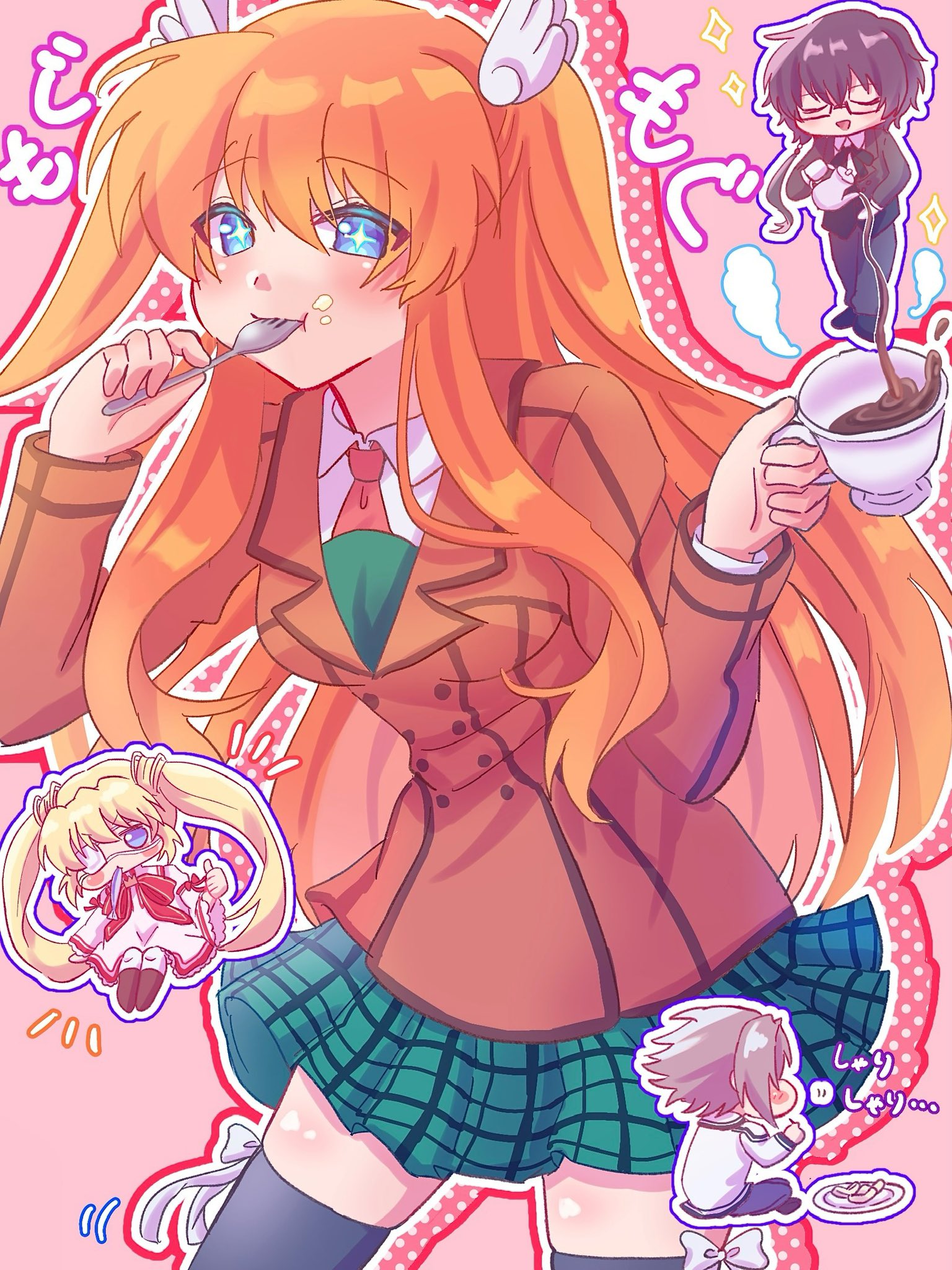+_+ 2boys 2girls :d :t black-framed_eyewear black_bow black_bowtie black_hair black_jacket black_pants black_suit black_thighhighs blonde_hair blue_eyes blush blush_stickers boots bow bow_legwear bowtie brother_and_sister brown_boots brown_jacket che11y_oo chibi chibi_inset closed_eyes closed_mouth coffee collared_shirt commentary copyright_notice cowboy_shot cup dress eating eyes_visible_through_hair floating_hair food food_on_face fork formal_clothes full_body glasses green_skirt grey_hair hair_between_eyes hair_ornament hands_up happy highres holding holding_cup holding_fork holding_teapot jacket kazamatsuri_institute_high_school_uniform long_hair long_sleeves looking_ahead looking_at_viewer medium_hair miniskirt multiple_boys multiple_girls nakatsu_shizuru necktie ootori_chihaya ootori_sakuya open_mouth orange_hair outline pants pink_background plaid_clothes plaid_skirt pleated_skirt pouring red_necktie rewrite school_uniform semi-rimless_eyewear shirt siblings sidelocks simple_background sitting skirt smile solo_focus sound_effects sparkle spiked_hair standing suit suit_jacket teacup teapot thighhighs thumbs_up twintails two_side_up very_long_hair white_bow white_dress white_jacket white_outline white_shirt wing_hair_ornament yoshino_haruhiko zettai_ryouiki