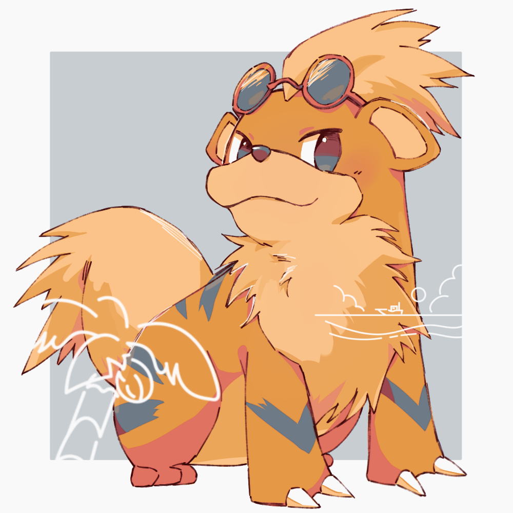 border claws closed_mouth commentary_request gen_1_pokemon grey_background growlithe harutao_(mecz5525) nintendo no_humans no_pupils pink-framed_eyewear pokemon pokemon_(creature) pokemon_focus smile solo standing sunglasses white_border