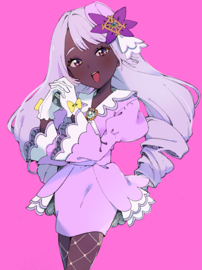 1girl :d commentary_request cowboy_shot dark-skinned_female dark_skin dress eyelashes fishnet_pantyhose fishnets glove_bow gloves grey_hair hands_up happy harutao_(mecz5525) hat hat_ornament holding holding_poke_ball interlocked_fingers jacinthe_(pokemon) long_hair looking_at_viewer luxury_ball nintendo open_mouth pantyhose pink_background poke_ball pokemon pokemon_legends:_z-a puffy_sleeves purple_dress smile solo teeth tilted_headwear twintails upper_teeth_only white_gloves