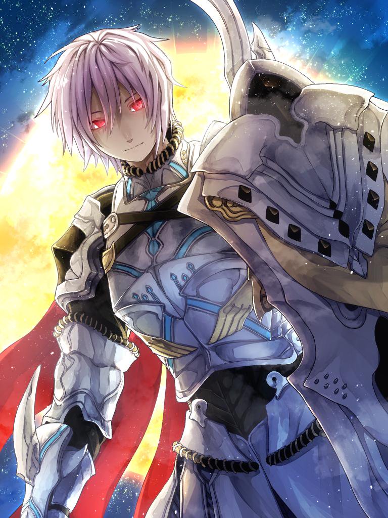 1boy armor chaos_galahad_(grimms_notes) closed_mouth cowboy_shot grey_armor grey_hair grimms_notes hair_between_eyes high_collar holding holding_shield looking_at_viewer male_focus pauldrons red_eyes shield short_hair shoulder_armor solo standing yako_(pzy)