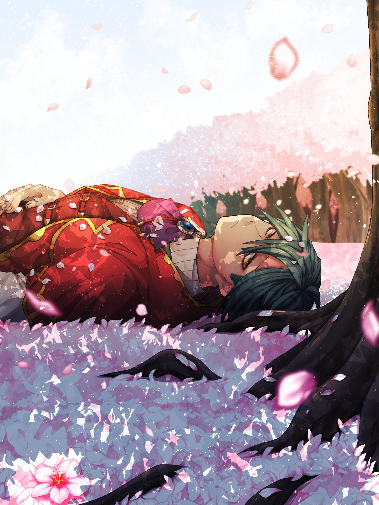 1boy blue_gem cherry_blossoms closed_mouth coat collared_shirt falling_petals gem green_hair grimms_notes highres looking_at_viewer ludwig_grimm_(grimms_notes) ludwig_grimm_(original)_(grimms_notes) male_focus official_alternate_costume open_clothes open_coat petals red_coat shirt short_hair solo tree vest white_shirt yako_(pzy) yellow_eyes