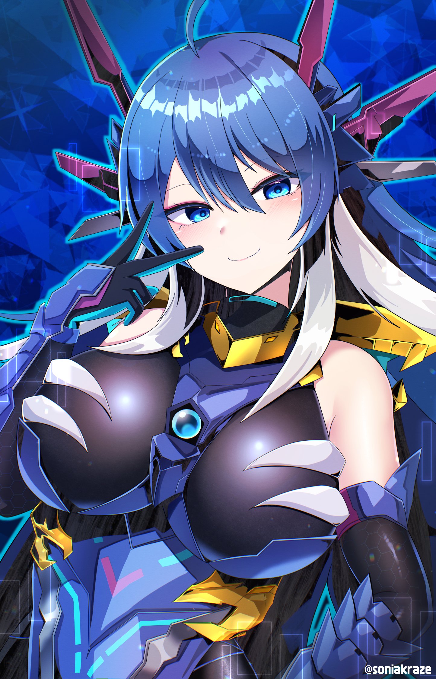 1girl ahoge amamiya_kure armor blue_armor blue_eyes breasts closed_mouth commentary_request dragon_girl dragon_horns duel_masters duel_masters_play's elbow_gloves gloves gold_armor grey_hair hair_between_eyes highres horns large_breasts leotard long_hair mechanical_horns multicolored_armor multicolored_hair q.e.d._(duel_masters) solo twitter_username upper_body v v_over_eye vambraces