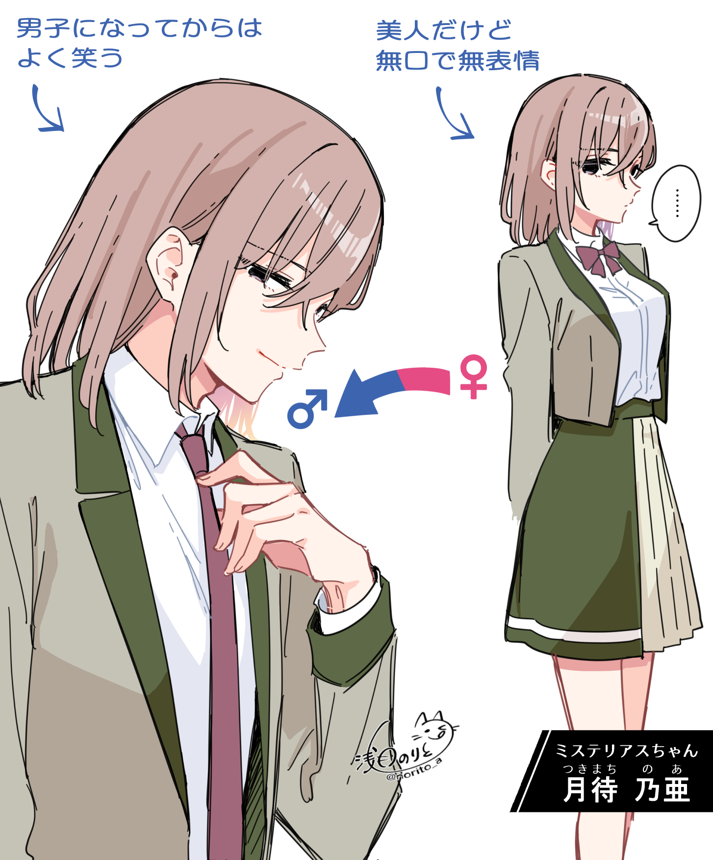 ... 1boy 1girl arms_behind_back arrow_(symbol) asazuki_norito black_eyes blazer bow bowtie breasts brown_hair character_name collared_shirt commentary_request copyright_name dual_persona feet_out_of_frame genderswap genderswap_(ftm) green_skirt grey_jacket hair_between_eyes highres jacket kimi_no_negai_ga_kanau_made long_hair long_sleeves mars_symbol medium_breasts necktie red_bow red_bowtie red_necktie revision school_uniform shirt simple_background skirt speech_bubble spoken_ellipsis translation_request tsukimachi_noa two-tone_skirt venus_symbol white_background white_shirt