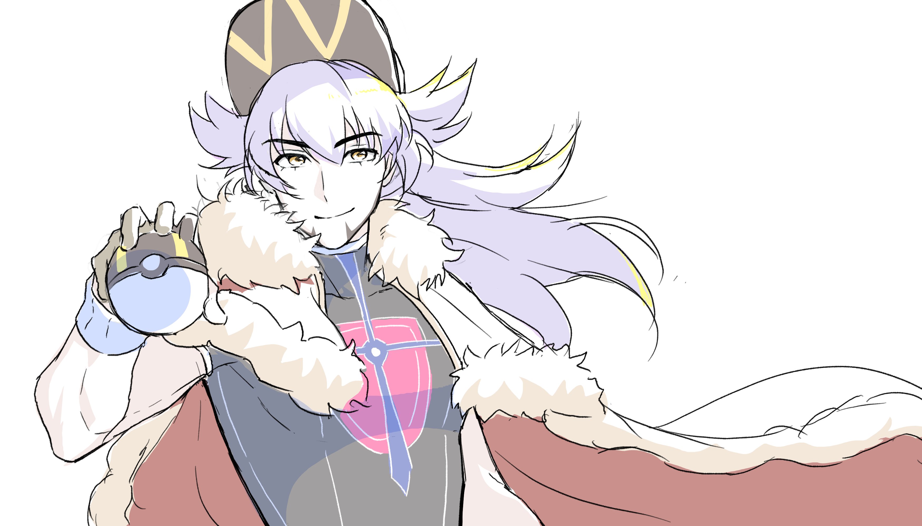 1boy absurdres cape ch_walnut champion_uniform closed_mouth commentary_request facial_hair floating_cape fur-trimmed_cape fur_trim gloves hair_between_eyes hand_up hat highres holding holding_poke_ball korean_commentary leon_(pokemon) long_hair male_focus nintendo partially_fingerless_gloves poke_ball pokemon pokemon_sword_and_shield print_shirt purple_hair red_cape shirt short_sleeves simple_background smile solo ultra_ball upper_body white_background wristband yellow_eyes
