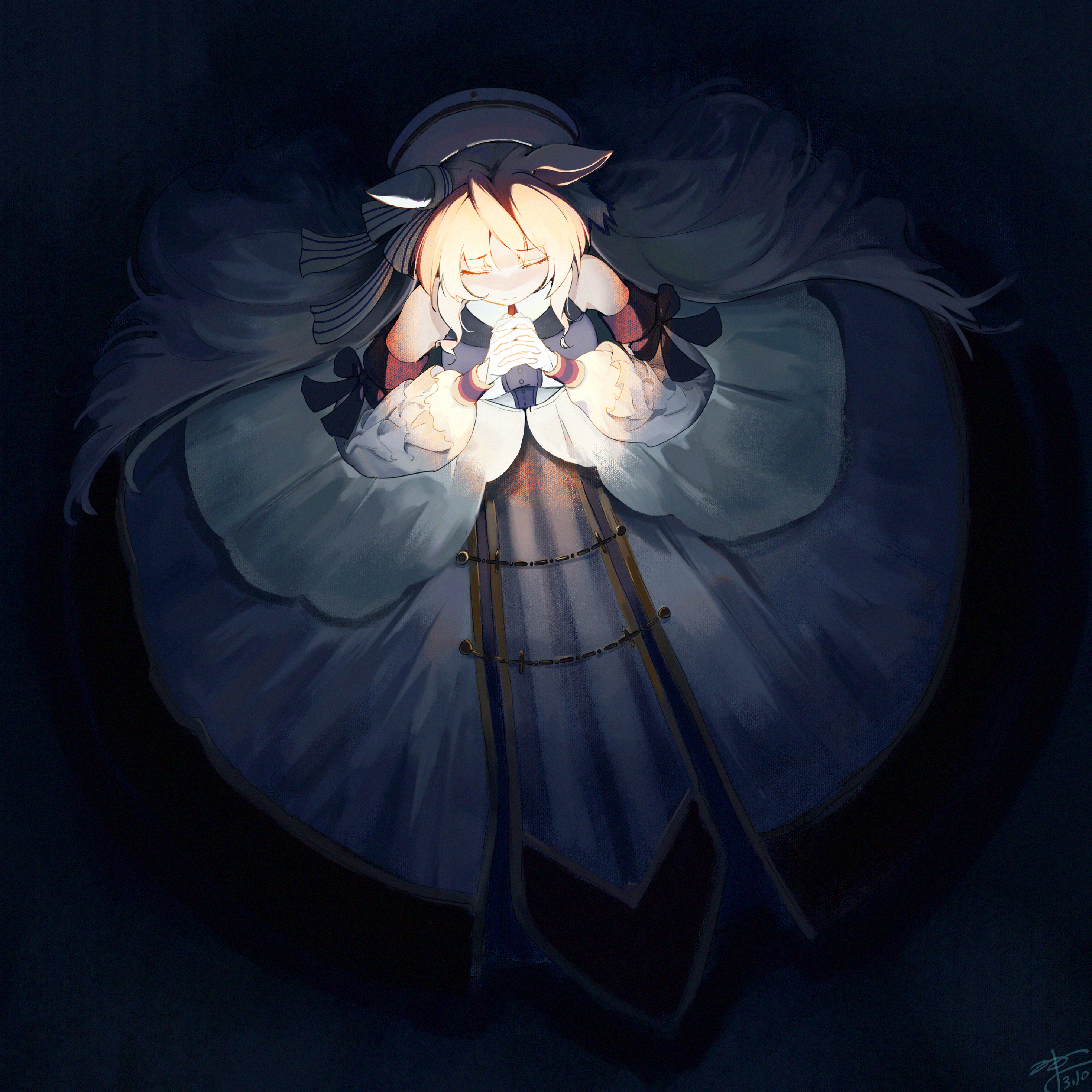 1girl absurdres animal_ears banpian_yezi bare_shoulders blonde_hair bow breasts closed_eyes closed_mouth commentary_request detached_sleeves dress ear_covers ear_ribbon from_above gloves hair_between_eyes hat highres horse_ears horse_girl interlocked_fingers long_hair necktie own_hands_clasped own_hands_together praying simple_background single_ear_cover solo umamusume victoire_pisa_(lueur_angelique)_(umamusume) victoire_pisa_(umamusume) white_dress white_gloves