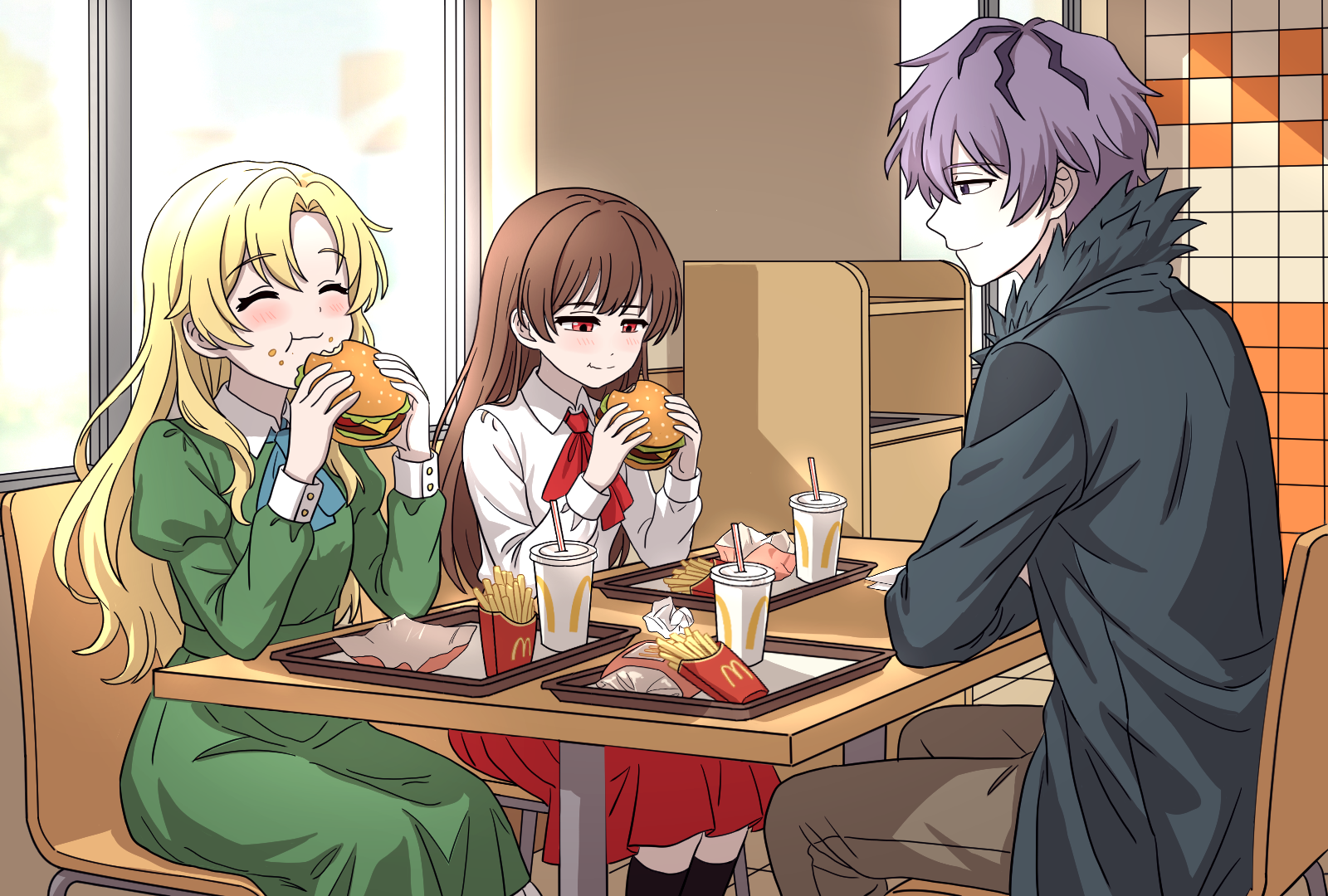 1boy 2girls alternate_universe ascot black_socks blonde_hair blue_ascot blush brown_hair burger chair chinese_commentary coat commentary_request cup disposable_cup dress drinking_straw eating food food_on_face french_fries garry_(ib) green_dress grey_coat highres holding holding_burger holding_food ib_(ib) ib_(kouri) indoors long_dress long_hair long_sleeves mary_(ib) mcdonald's mixed-language_commentary multiple_girls on_chair product_placement purple_hair red_ascot red_eyes red_skirt restaurant shirt short_hair sitting skirt smile socks table tray white_shirt window yanyanv888