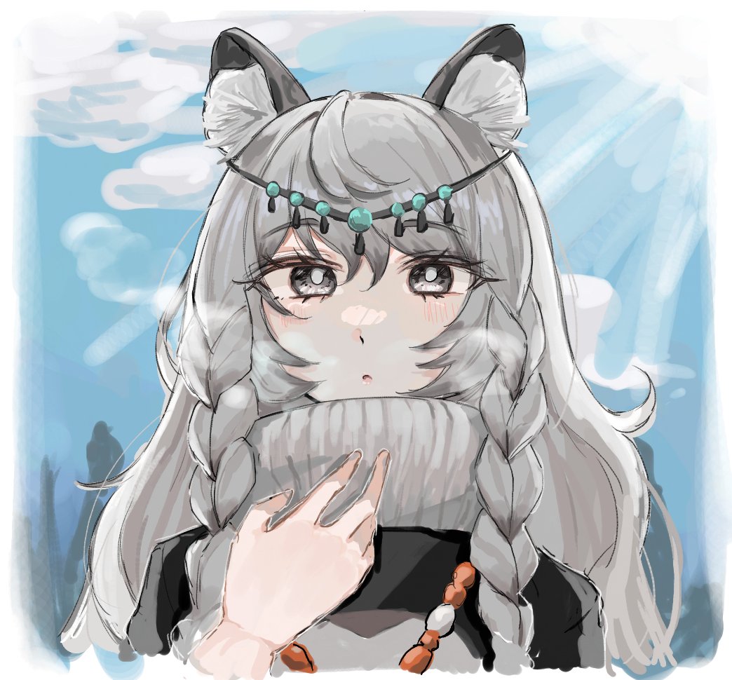 1girl :o animal_ears arknights black_eyes braid breath commentary cropped_shoulders grey_hair head_chain jewelry light_blush long_hair looking_at_viewer paint_chat_(medium) parted_lips pramanix_(arknights) side_braids solo turtleneck twin_braids uzuc4g0