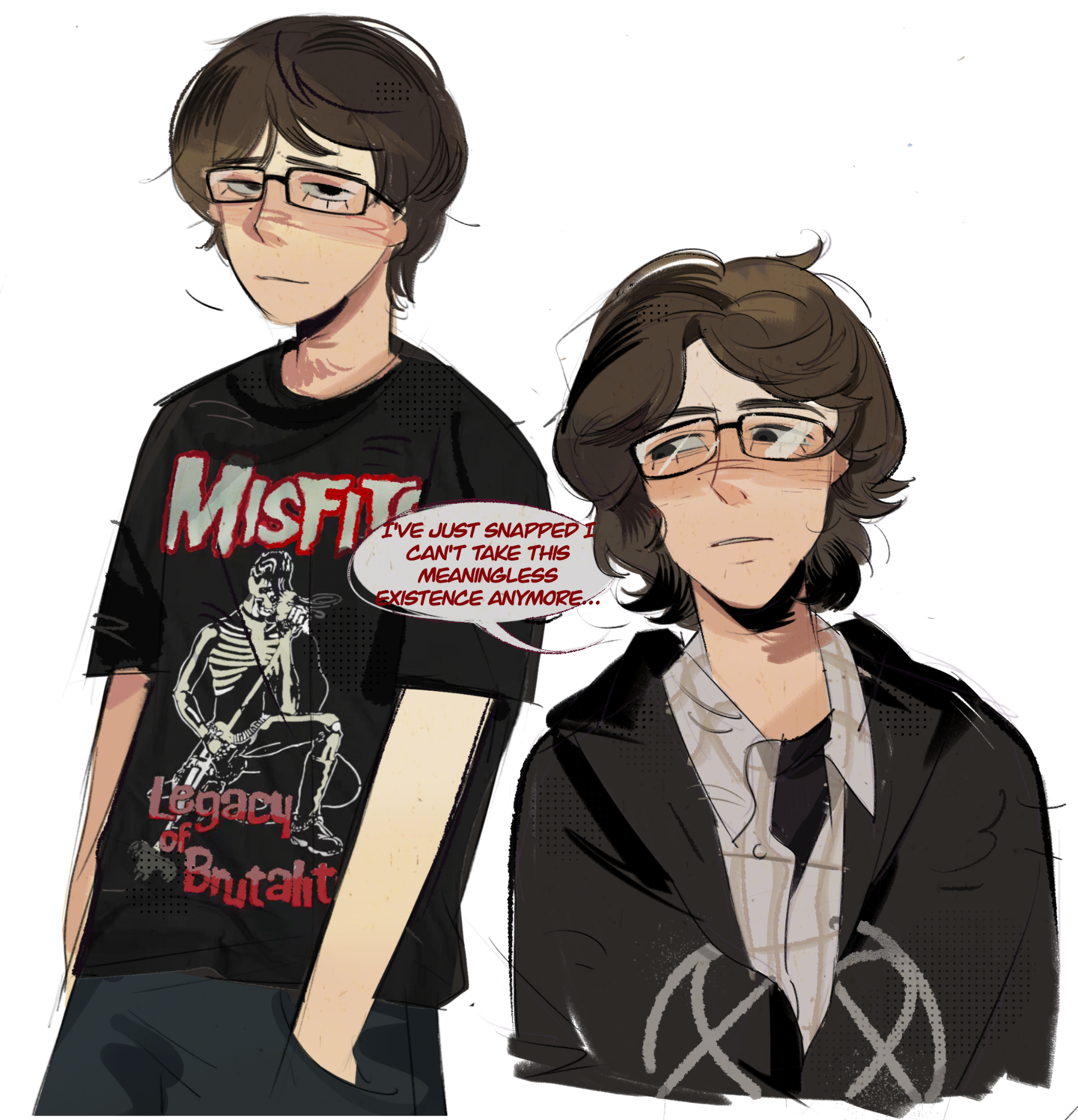 2boys aged_down animification arms_at_sides bare_arms black-framed_eyewear black_eyes black_jacket blush brown_hair clothes_writing collared_shirt cowboy_shot cropped_torso curly_hair dual_persona english_text facing_viewer glasses goodfolk2 grey_shirt hair_behind_ear halftone hands_in_pockets highres jacket long_sleeves looking_at_viewer looking_to_the_side male_focus multiple_boys nose_blush partially_unzipped plaid_clothes plaid_shirt raised_inner_eyebrows real_life robert_hawkins shirt short_hair short_sleeves sideways_glance simple_background speech_bubble standing t-shirt true_crime undershirt very_short_hair white_background