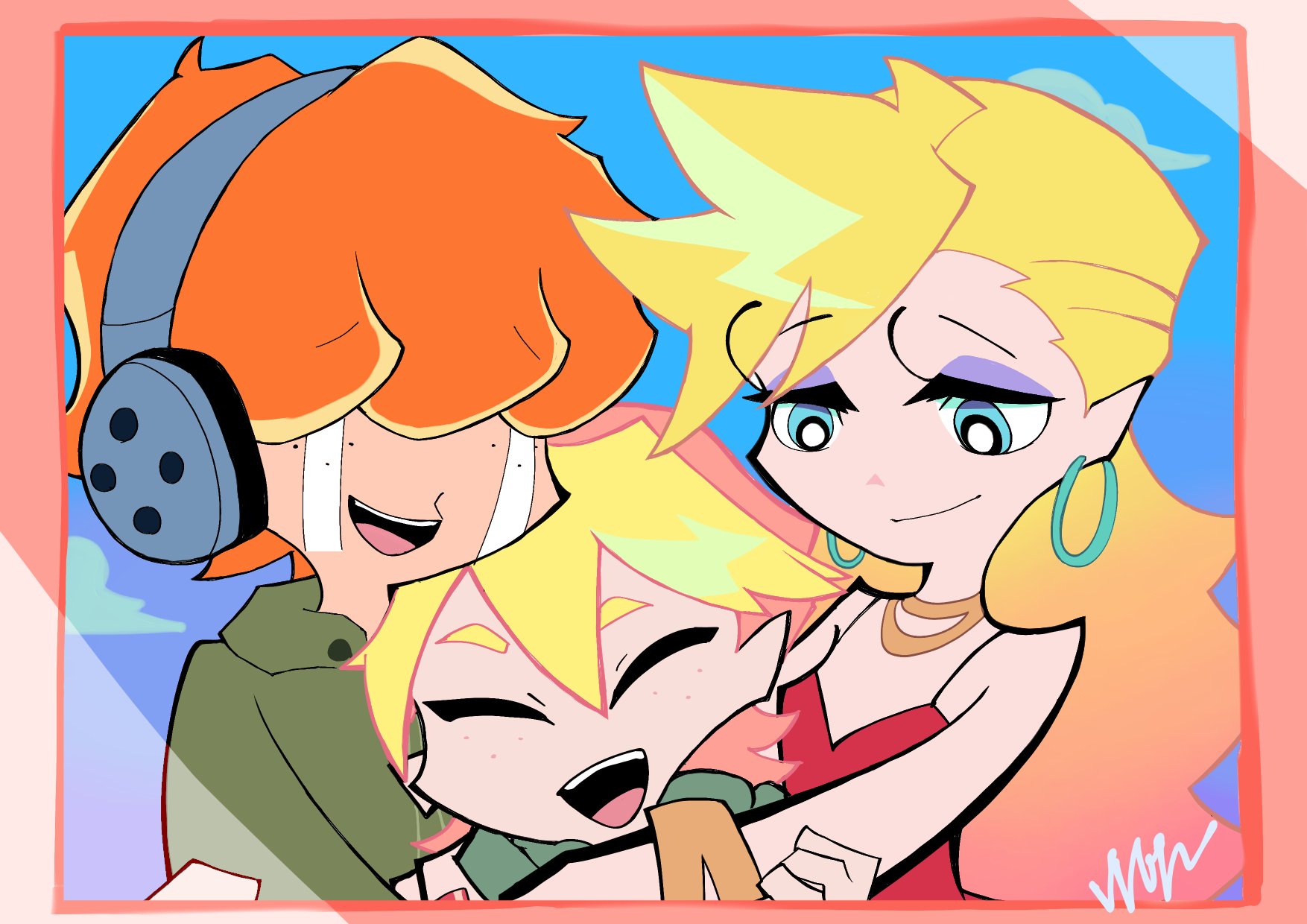 1girl 2boys blonde_hair blue_eyes blue_sky breasts brief_(psg) cloud couple dress earrings family father_and_child father_and_son freckles ghostbusters_uniform gradient_hair green_hoodie hair_over_eyes happy headphones hetero highres hood hoodie hoop_earrings hug husband_and_wife jewelry junior_(psg) long_hair mother_and_child mother_and_son multicolored_hair multiple_boys official_style open_mouth orange_hair panty_&_stocking_with_garterbelt panty_(psg) parent_and_child red_dress short_hair sky smile tearing_up tears teeth translation_request upper_teeth_only vvonpino