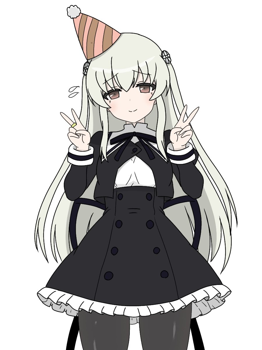 1girl assault_lily black_pantyhose black_ribbon black_skirt blush breasts brown_eyes buttons closed_mouth commentary_request cowboy_shot cropped_jacket double_v egawa_kusumi flower flying_sweatdrops frilled_skirt frills grey_hair hair_flower hair_ornament hands_up hat high-waist_skirt highres jewelry kimassi long_hair looking_at_viewer medium_breasts miniskirt neck_ribbon pantyhose party_hat pom_pom_(clothes) raised_eyebrows ribbon ring school_uniform shirt sidelocks simple_background skirt smile solo standing tilted_headwear v very_long_hair white_background white_flower white_shirt yurigaoka_girls_academy_school_uniform