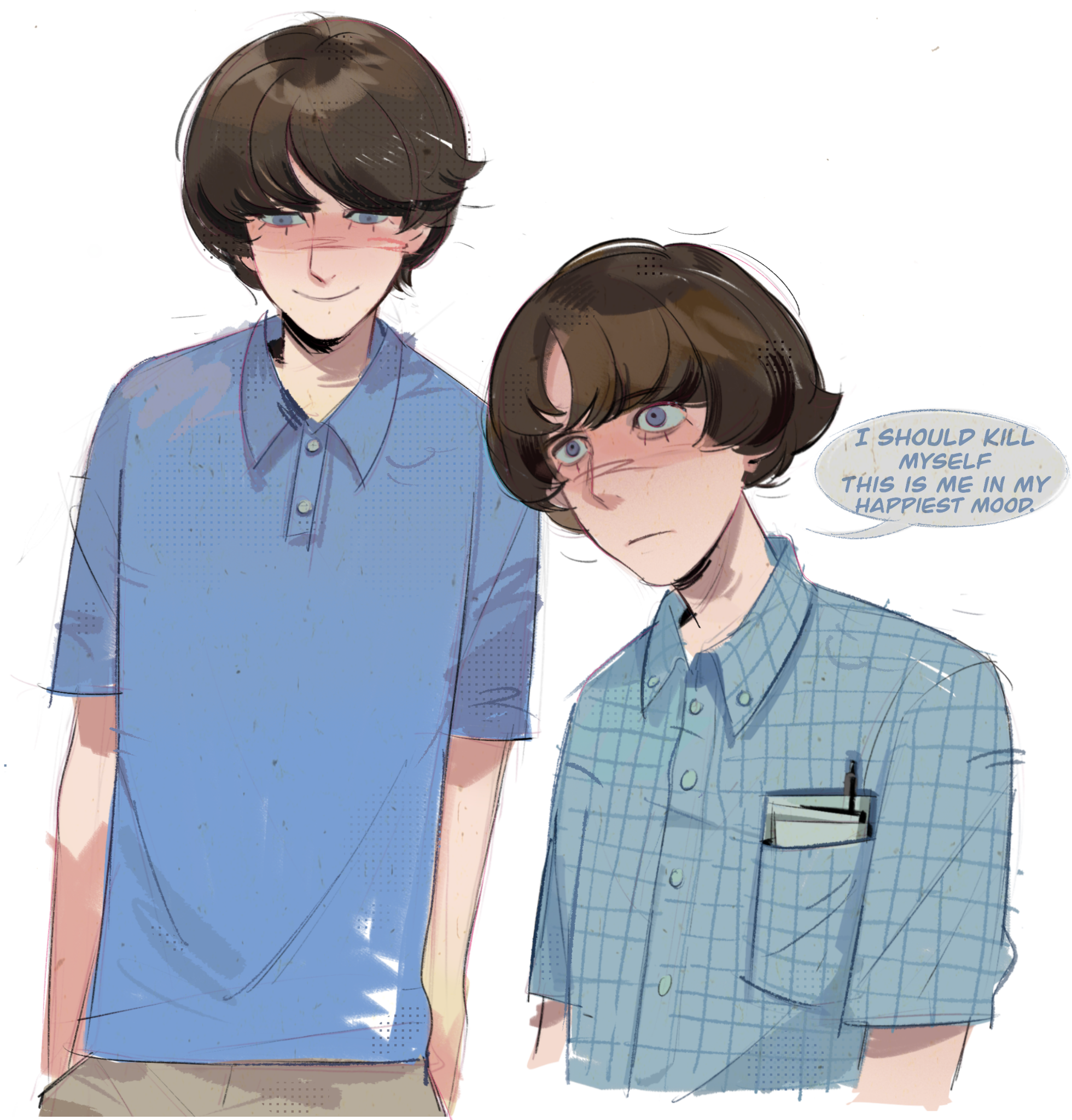 2boys adam_lanza aged_down animification arms_at_sides bare_arms blue_eyes blue_shirt brown_hair brown_pants buttons closed_mouth collared_shirt cowboy_shot cropped_torso dual_persona english_text frown goodfolk2 highres looking_ahead looking_at_viewer lower_eyelashes_only male_focus multiple_boys object_in_pocket pants pen_in_pocket photo-referenced plaid_clothes plaid_shirt pocket polo_shirt real_life shaded_face shirt short_hair short_sleeves simple_background smile speech_bubble standing straight-on swept_bangs true_crime very_short_hair white_background