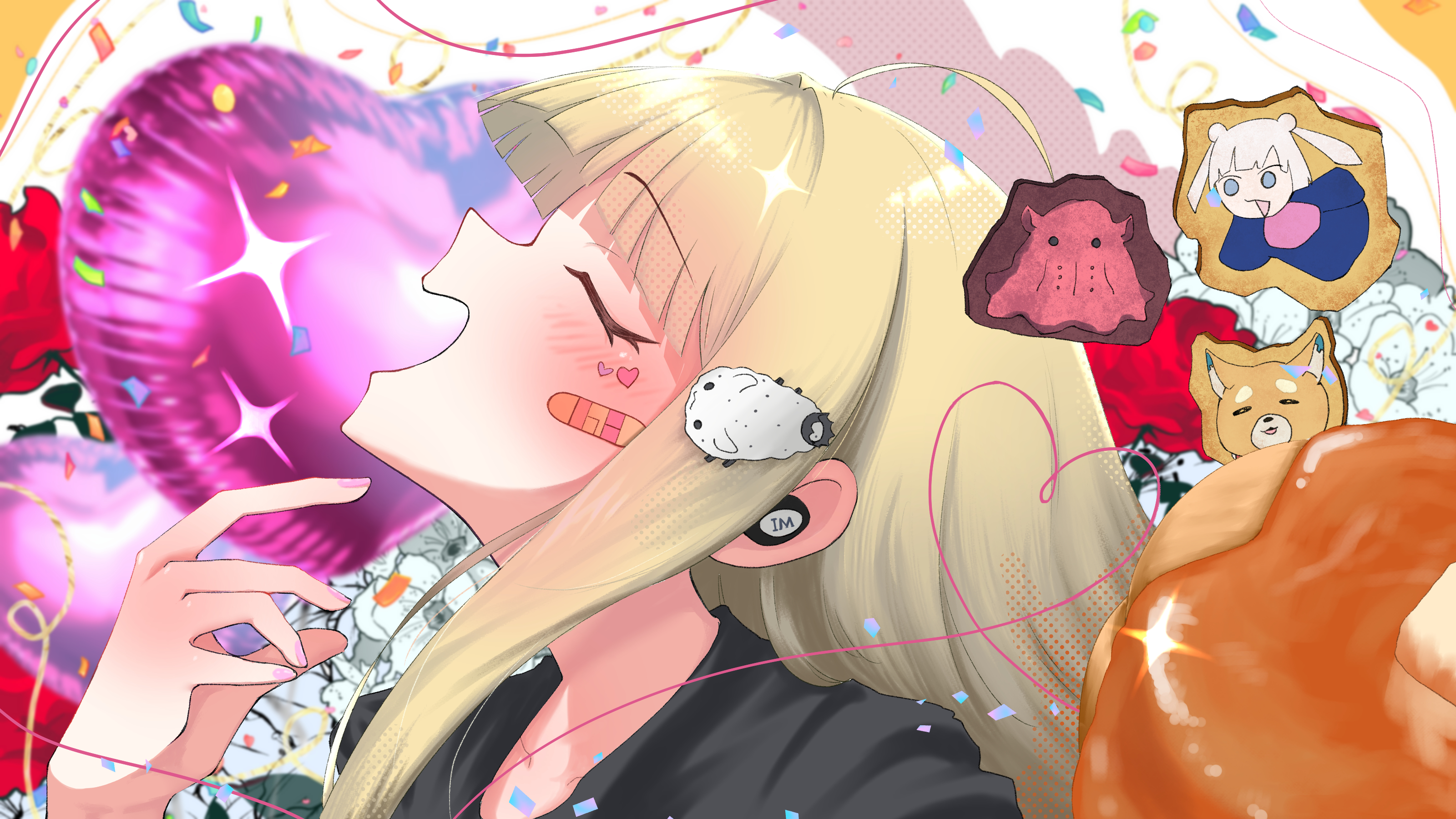 1girl absurdres ahoge ai_kotoba_iv_(vocaloid) asaq_gl balloon black_shirt blonde_hair blunt_bangs blush cardboard_cutout cho_kaguya-hime! collarbone commentary_request facial_mark fushi_(cho_kaguya-hime!) heart heart_balloon heart_facial_mark heart_of_string highres inudoge kaguya_(cho_kaguya-hime!) long_hair open_mouth profile runami_yachiyo shirt sidelocks solo sparkle straight_hair t-shirt umbrella_octopus wireless_earphones