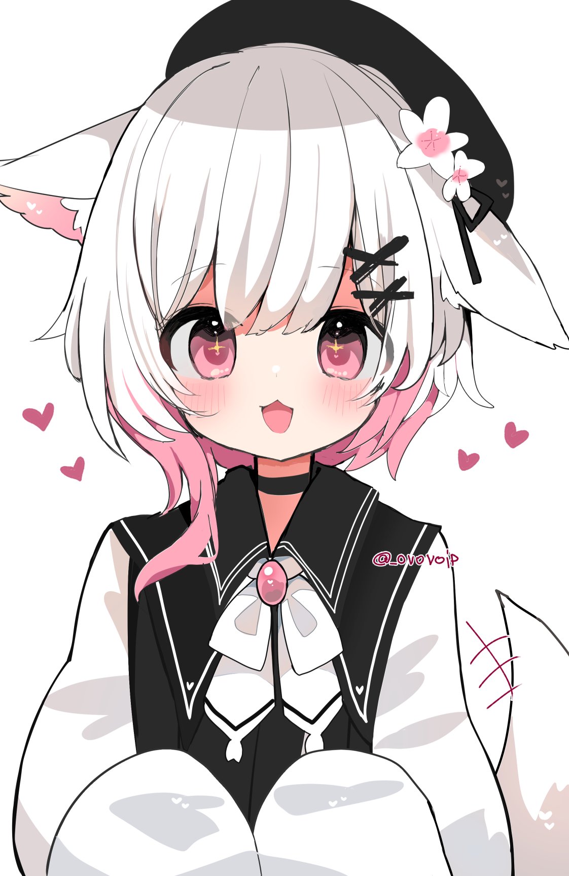 1girl :3 animal_ears beret black_choker black_hat brooch choker commentary_request dog_ears dog_girl dog_tail flower gradient_hair hair_ornament hat highres jewelry kemonomimi_mode long_sleeves looking_at_viewer mahou_shoujo_no_majo_saiban multicolored_hair neck_ribbon open_mouth pink_eyes pink_hair ribbon sakuraba_ema shirasuame_shiromaru short_hair smile solo tail upper_body white_background white_flower white_hair white_ribbon x_hair_ornament