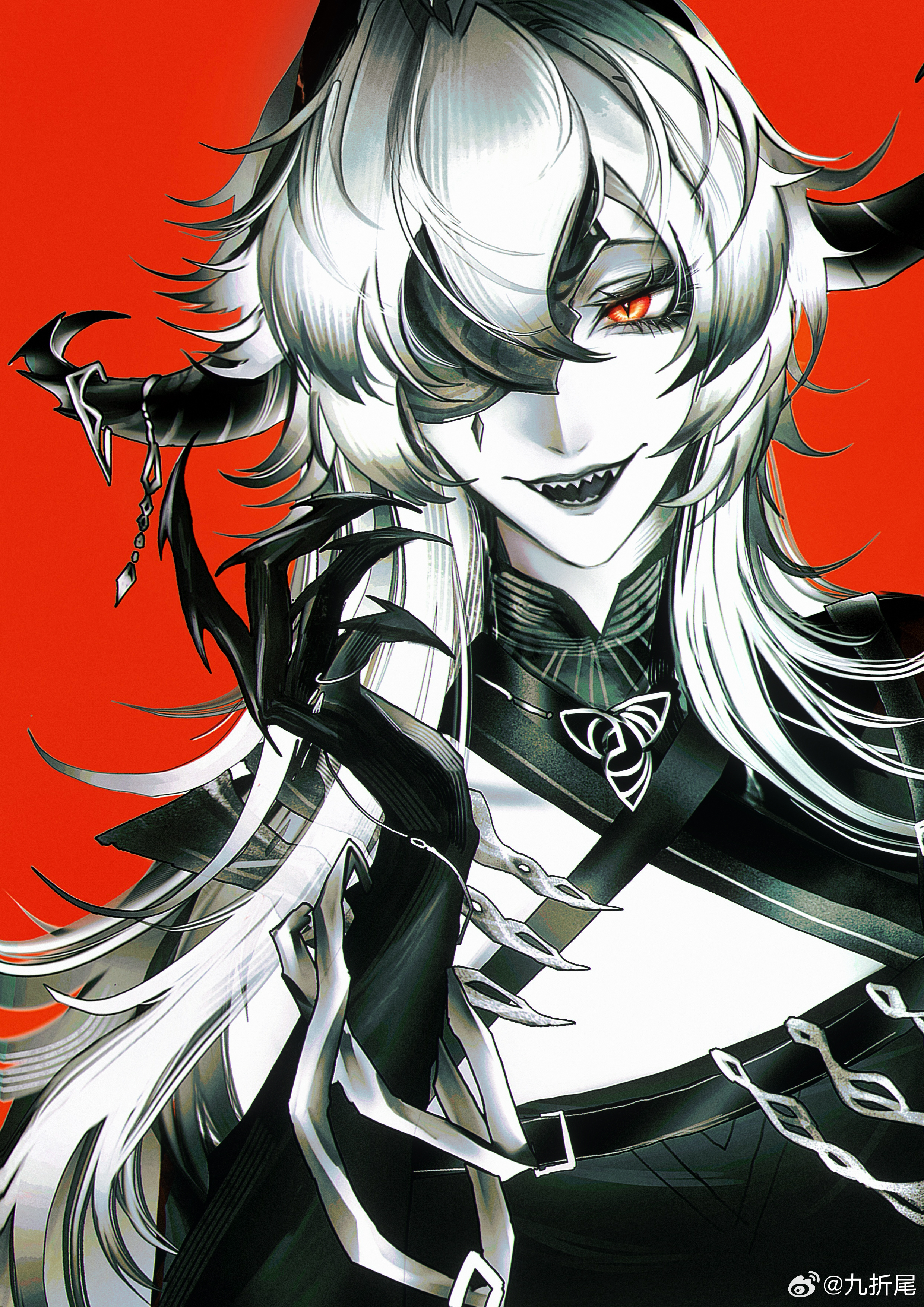 1girl absurdres chinese_commentary claws commentary dutch_angle eye_mask hair_between_eyes half_mask highres horn_ornament horns limited_palette long_hair looking_at_viewer mask one_eye_covered open_mouth path_to_nowhere red_background red_eyes simple_background slit_pupils smile solo straight-on synex_(path_to_nowhere) upper_body watermark weibo_username weibo_watermark yu_zhezhe