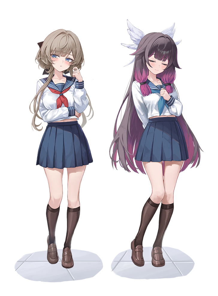2girls alternate_costume arm_behind_back black_hair black_socks blue_eyes blue_neckerchief blue_sailor_collar blue_skirt blush brown_hair brown_shoes closed_eyes closed_mouth columbina_(genshin_impact) commentary full_body genshin_impact hair_ornament hand_up kneehighs long_hair long_sidelocks long_sleeves midriff_peek mookyuu9 multicolored_hair multiple_girls neckerchief pleated_skirt purple_hair red_neckerchief sailor_collar sandrone_(genshin_impact) shirt shoes short_hair_with_long_locks sidelocks simple_background skirt smile socks standing untranslatable_commentary very_long_hair white_background white_shirt wing_hair_ornament