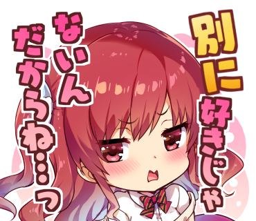 1girl blush bow bowtie chibi chibi_only collared_shirt commentary_request cropped hisasi long_hair looking_at_viewer lowres matsukawa_mei_(hisasi) off_shoulder open_mouth original pink_eyes red_bow red_bowtie red_hair school_uniform shirt solo translation_request white_shirt
