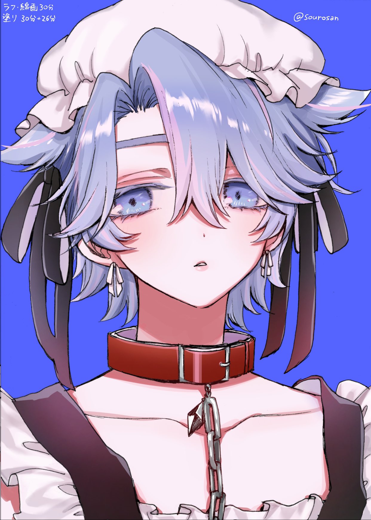 1boy animal_ears big_bad_wolf big_bad_wolf_(cosplay) black_ribbon blue_background blue_eyes blue_hair chain chain_leash collar commentary_request cosplay hair_between_eyes hair_ribbon hat highres hughie_(pretty_series) leash little_red_riding_hood_(fairy_tale) looking_at_viewer male_focus mob_cap multicolored_hair parted_lips pretty_series red_collar ribbon short_hair simple_background solo streaked_hair teruteru-san upper_body waccha_primagi! wolf_boy wolf_ears