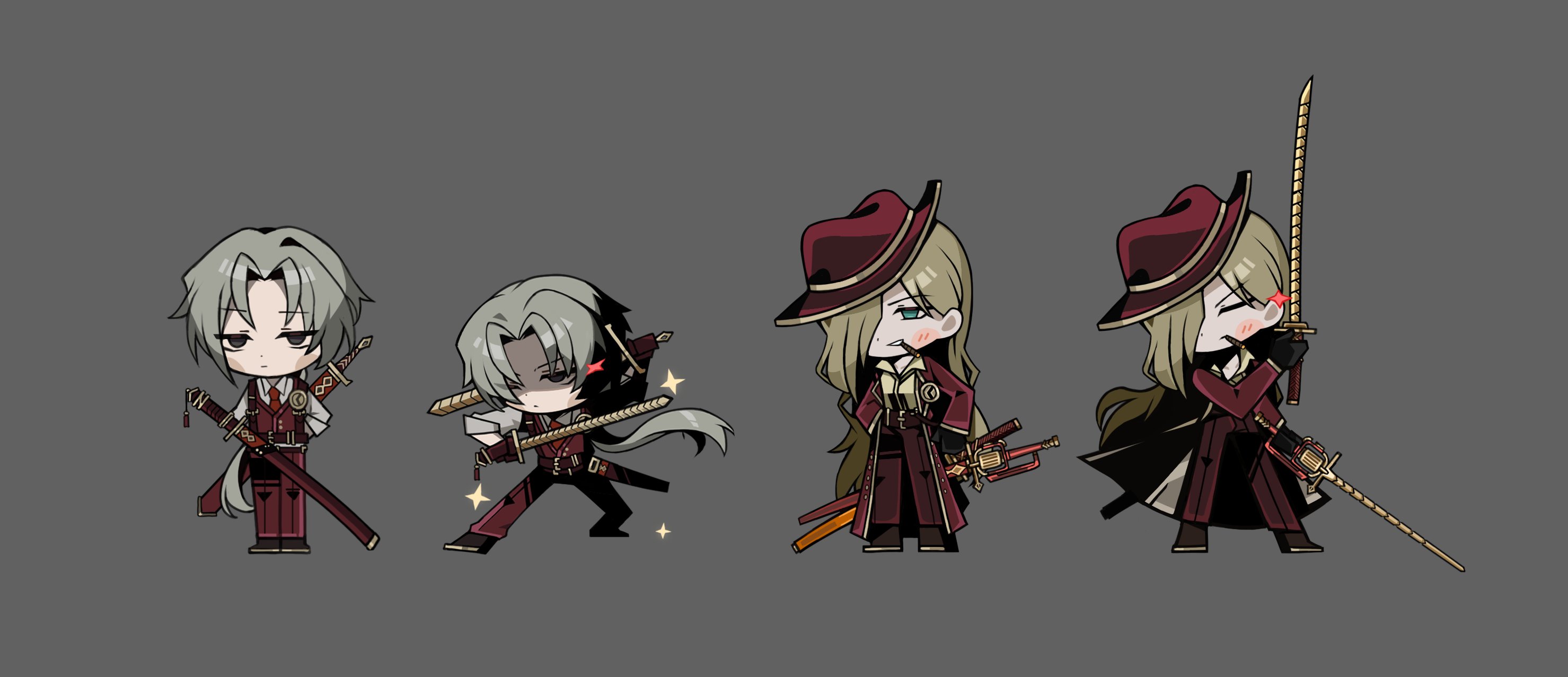 1boy 1girl blue_eyes brown_hair closed_mouth coat dual_wielding grey_background hair_over_one_eye hat highres holding limbus_company long_hair lucio_(project_moon) pants parted_lips project_moon purple_eyes red_coat red_hat red_pants red_vest simple_background smile sparkle ssong25z valencina_(project_moon) very_long_hair vest