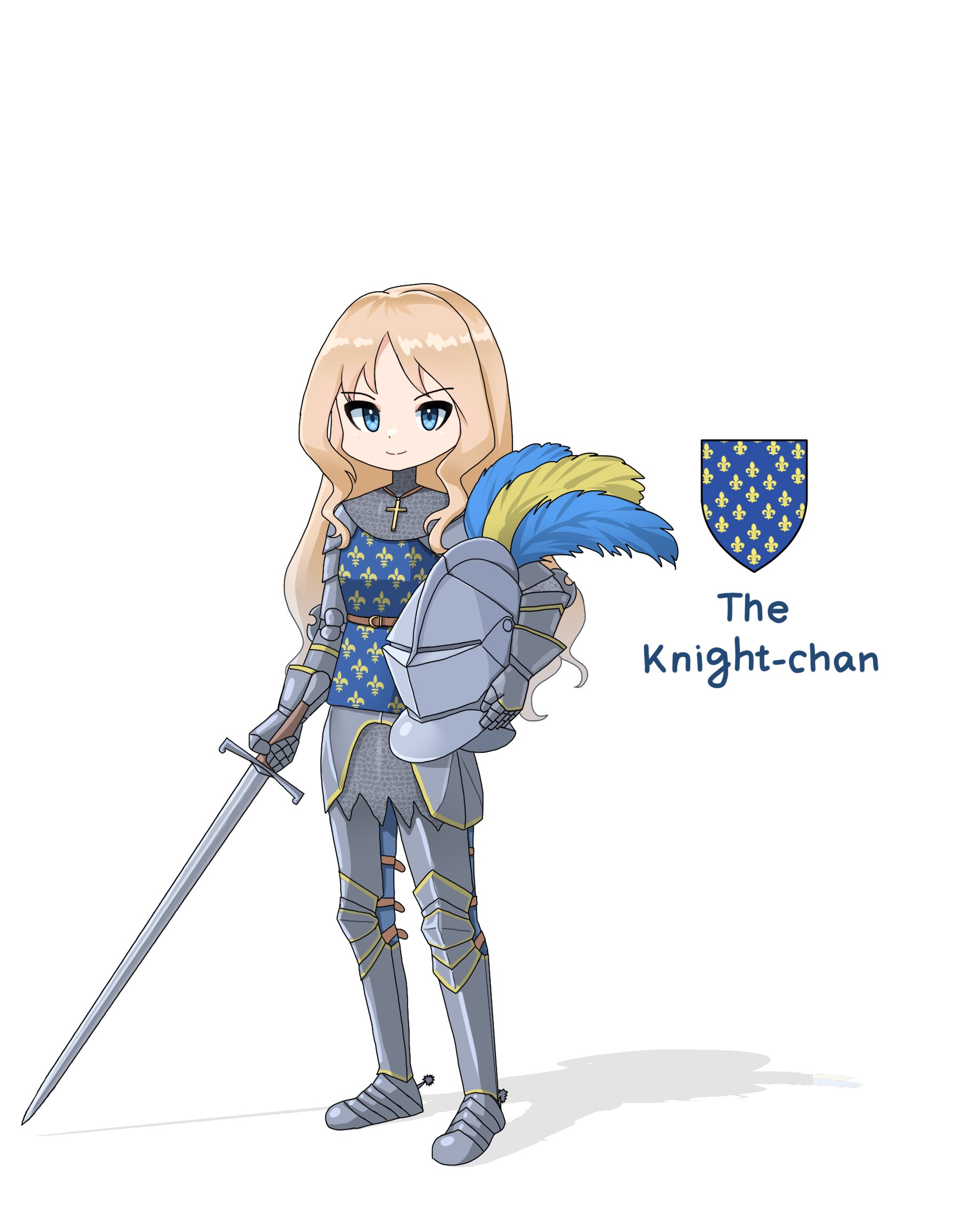 1girl armor belt blonde_hair blue_eyes blue_feathers blue_surcoat chainmail character_name closed_mouth coat_of_arms commentary cross cross_necklace english_commentary english_text feathers fleur-de-lis france full_armor full_body gauntlets greaves helmet heraldry highres holding holding_sword holding_unworn_helmet holding_weapon invisible_floor jewelry leochan1202 long_hair looking_at_viewer medieval necklace original pauldrons plate_armor plume real_life sabaton shadow shoulder_armor simple_background smile soldier solo spurs surcoat sword unworn_headwear unworn_helmet wavy_hair weapon white_background yellow_feathers