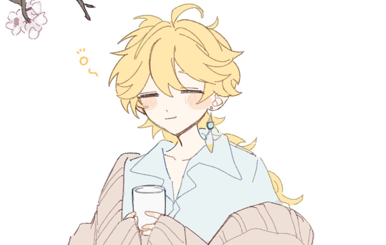 1boy aether_(genshin_impact) ahoge alternate_costume blonde_hair blue_shirt blush branch brown_cardigan cardigan cherry_blossoms closed_eyes closed_mouth collarbone collared_shirt commentary_request cup earrings flower genshin_impact hair_between_eyes hands_up holding holding_cup jewelry long_hair long_sleeves low_ponytail male_focus open_cardigan open_clothes ponytail puffy_long_sleeves puffy_sleeves shirt simple_background single_earring sleepy smile solo suya_x0 upper_body wavy_hair white_background white_flower