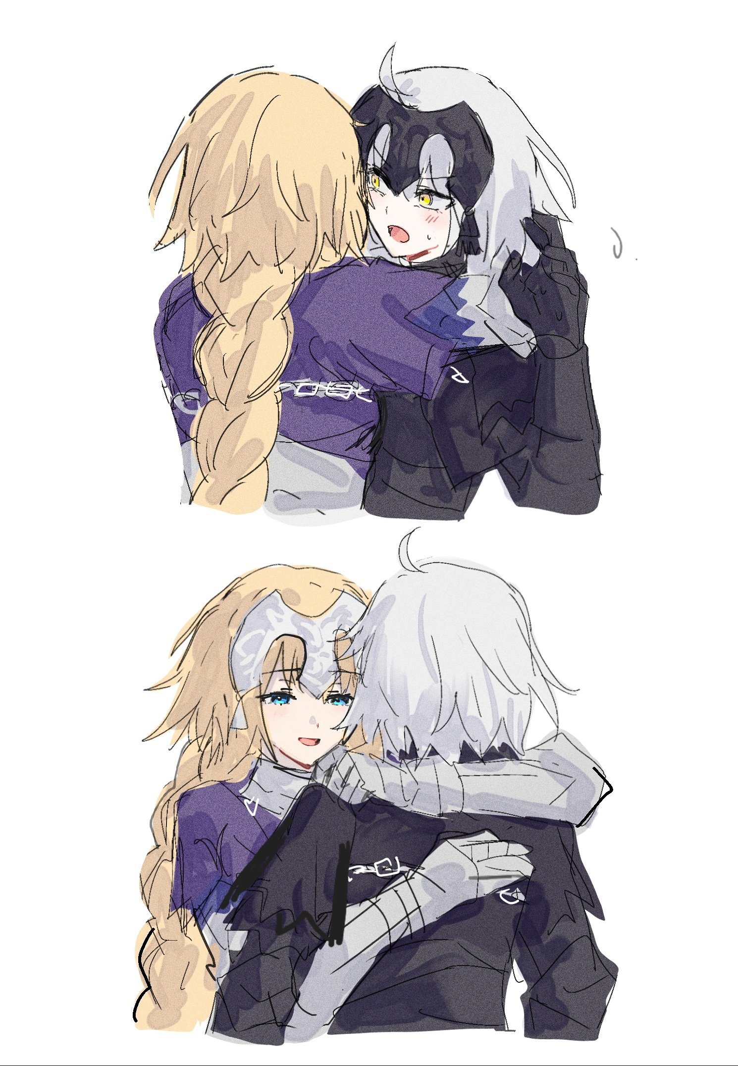 2girls ahoge armor armored_dress black_armor black_capelet black_dress blonde_hair blue_eyes blush braid capelet chain clenched_hands dress dual_persona fate/grand_order fate_(series) from_behind gauntlets grey_armor grey_hair hair_between_eyes half-closed_eyes hand_on_another's_back headpiece highres hug jeanne_d'arc_(fate) jeanne_d'arc_(ruler)_(fate) jeanne_d'arc_alter_(avenger)_(fate) jeanne_d'arc_alter_(fate) juliet_sleeves long_hair long_sleeves looking_at_another low-braided_long_hair low-tied_long_hair multiple_girls multiple_views nekwnek open_mouth pale_skin puffy_sleeves purple_dress short_hair shy simple_background single_braid smile sweatdrop tassel tongue upper_body white_background yellow_eyes
