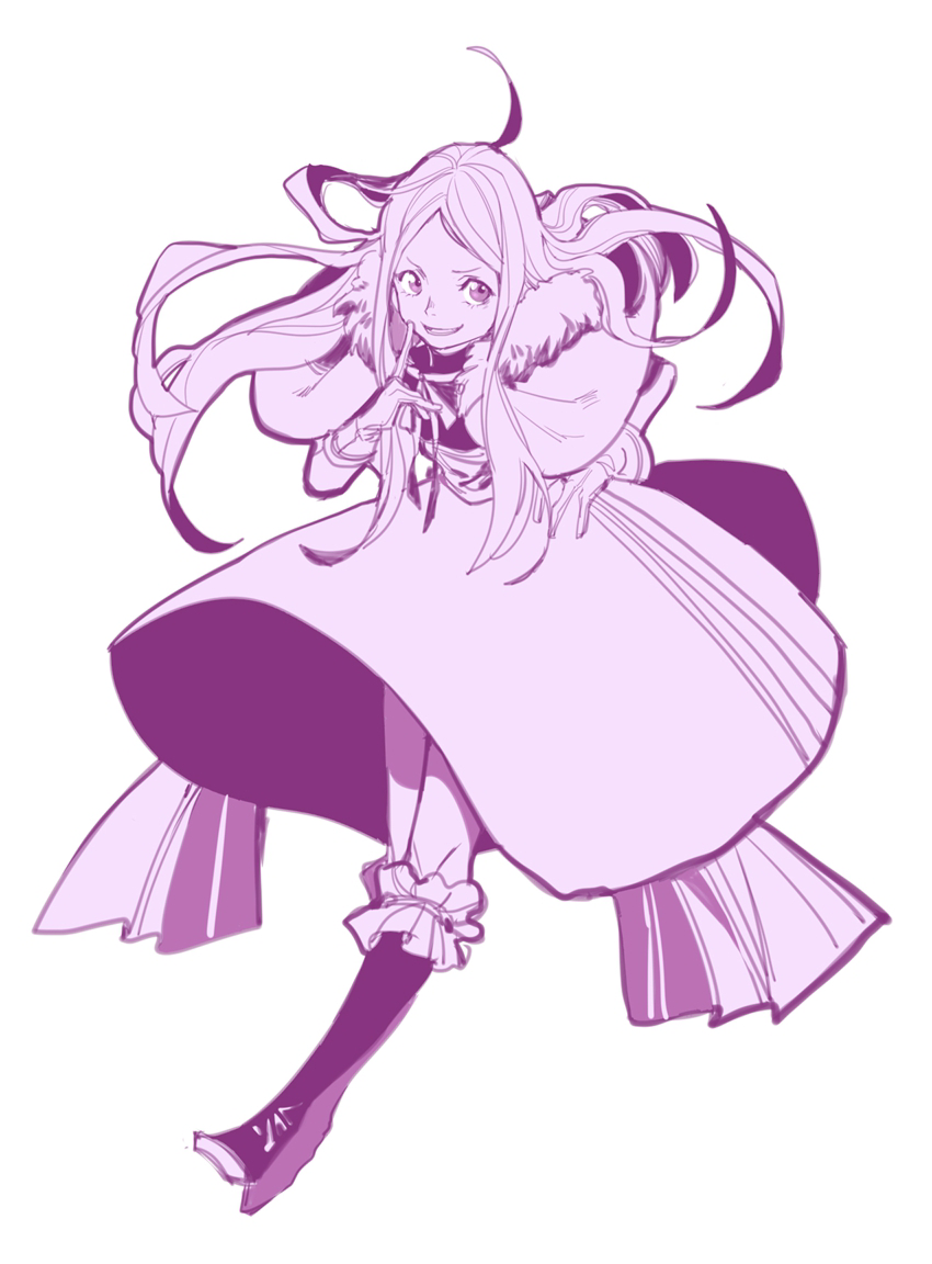 capelet chacha_(fate) fate/grand_order fate_(series) full_body fur-trimmed_capelet fur_trim gloves hand_on_own_hip hand_up kneehighs kuzen long_hair long_sidelocks looking_at_viewer ribbon sidelocks skirt smug socks