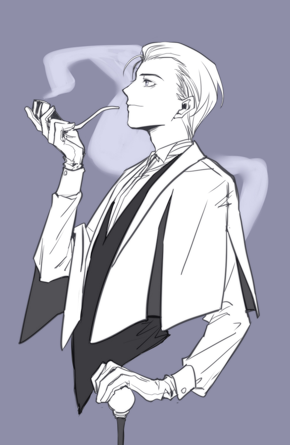 1boy cane fate/grand_order fate_(series) from_side gloves grey_background greyscale highres holding holding_cane holding_smoking_pipe kuzen long_sleeves looking_up male_focus monochrome profile sherlock_holmes_(fate) shirt short_hair smile smoking_pipe solo vest wingtip_collar