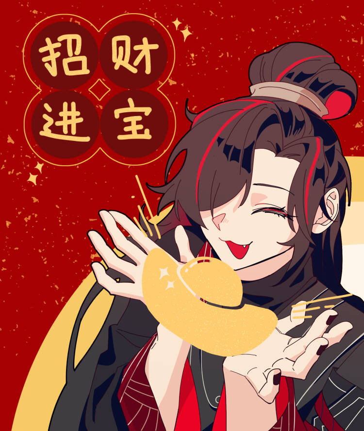1girl :3 black_coat black_hair black_hanfu black_nails chinese_clothes chinese_commentary chinese_new_year coat commentary_request hair_bun hands_up hanfu limbus_company long_hair long_sleeves multicolored_hair nobunobanobu open_mouth parted_bangs project_moon red_background red_streaks simple_background smile solo sparkle streaked_hair very_long_hair wide_sleeves yuanbao zigong_(project_moon)