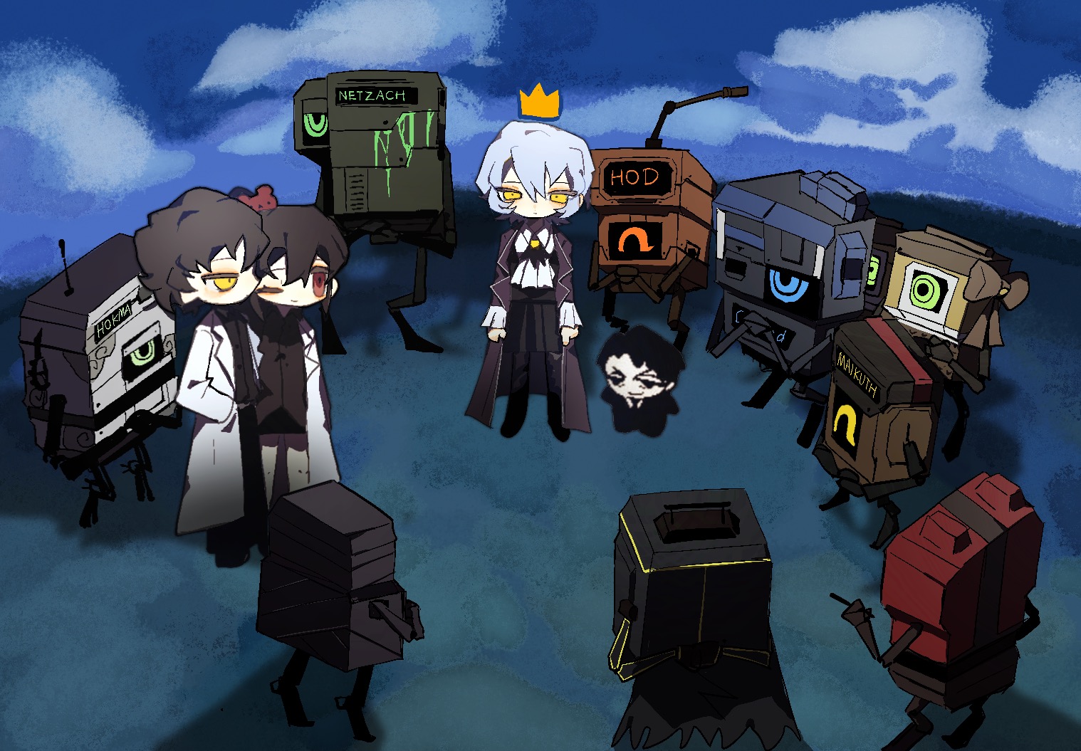 2boys 2girls angela_(project_moon) ascot ayin_(project_moon) binah_(project_moon) black_eyes black_hair blue_coat blue_hair brown_hair carmen_(project_moon) chesed_(project_moon) chinese_commentary coat commentary_request crown gebura_(project_moon) high_ponytail hod_(project_moon) hokma_(project_moon) lab_coat lapels library_of_ruina lobotomy_corporation malkuth_(project_moon) multiple_boys multiple_girls netzach_(project_moon) notched_lapels ponytail project_moon red_eyes robot roland_(project_moon) short_hair standing tiphereth_a_(project_moon) white_ascot white_coat y0k0000 yellow_eyes yesod_(project_moon)