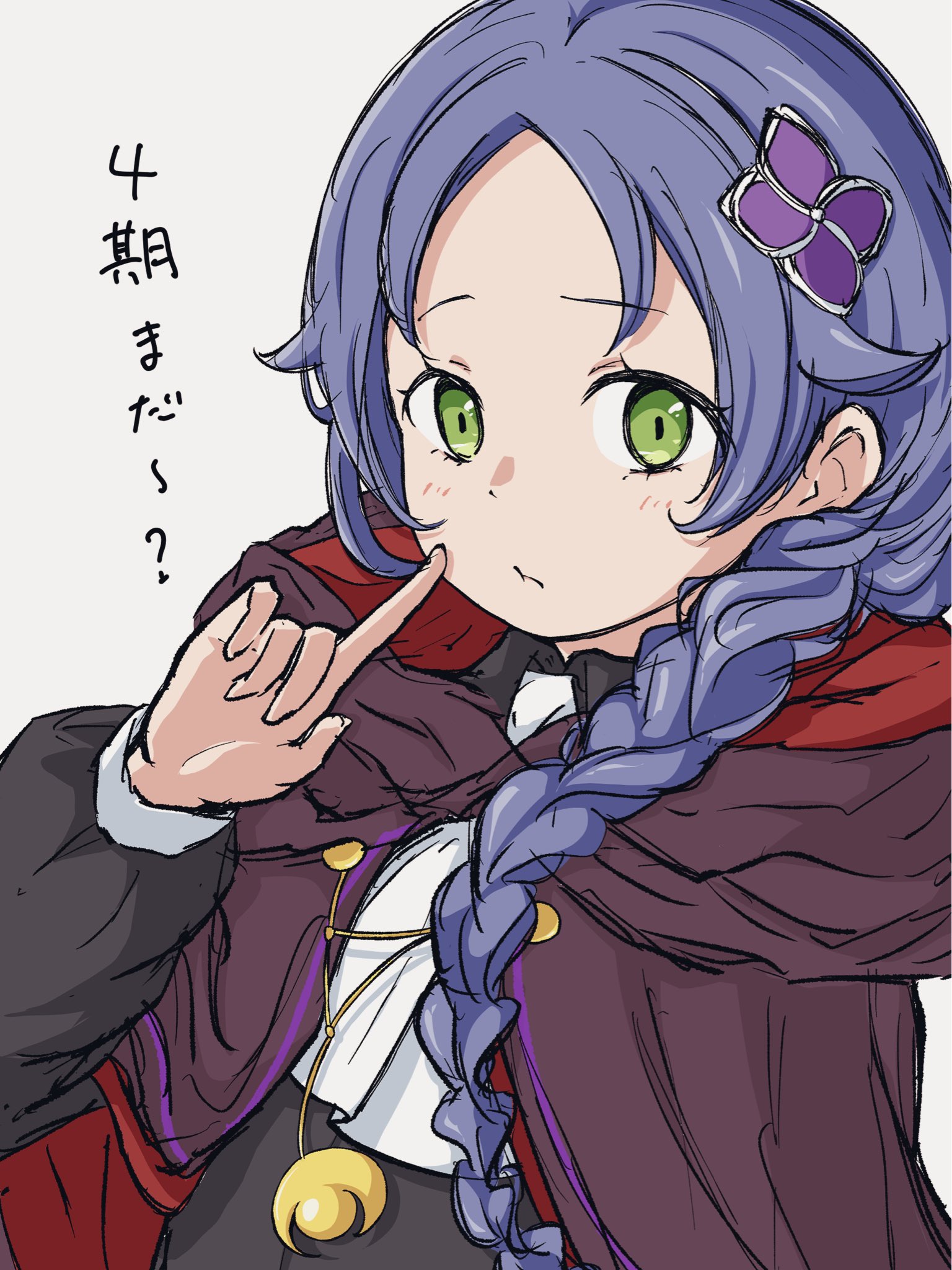 1girl blue_hair braid braided_ponytail cloak closed_mouth commentary_request green_eyes hair_ornament highres hood hood_down long_hair long_sleeves looking_at_viewer meili_portroute mo_0508 re:zero_kara_hajimeru_isekai_seikatsu simple_background single_braid sketch solo upper_body