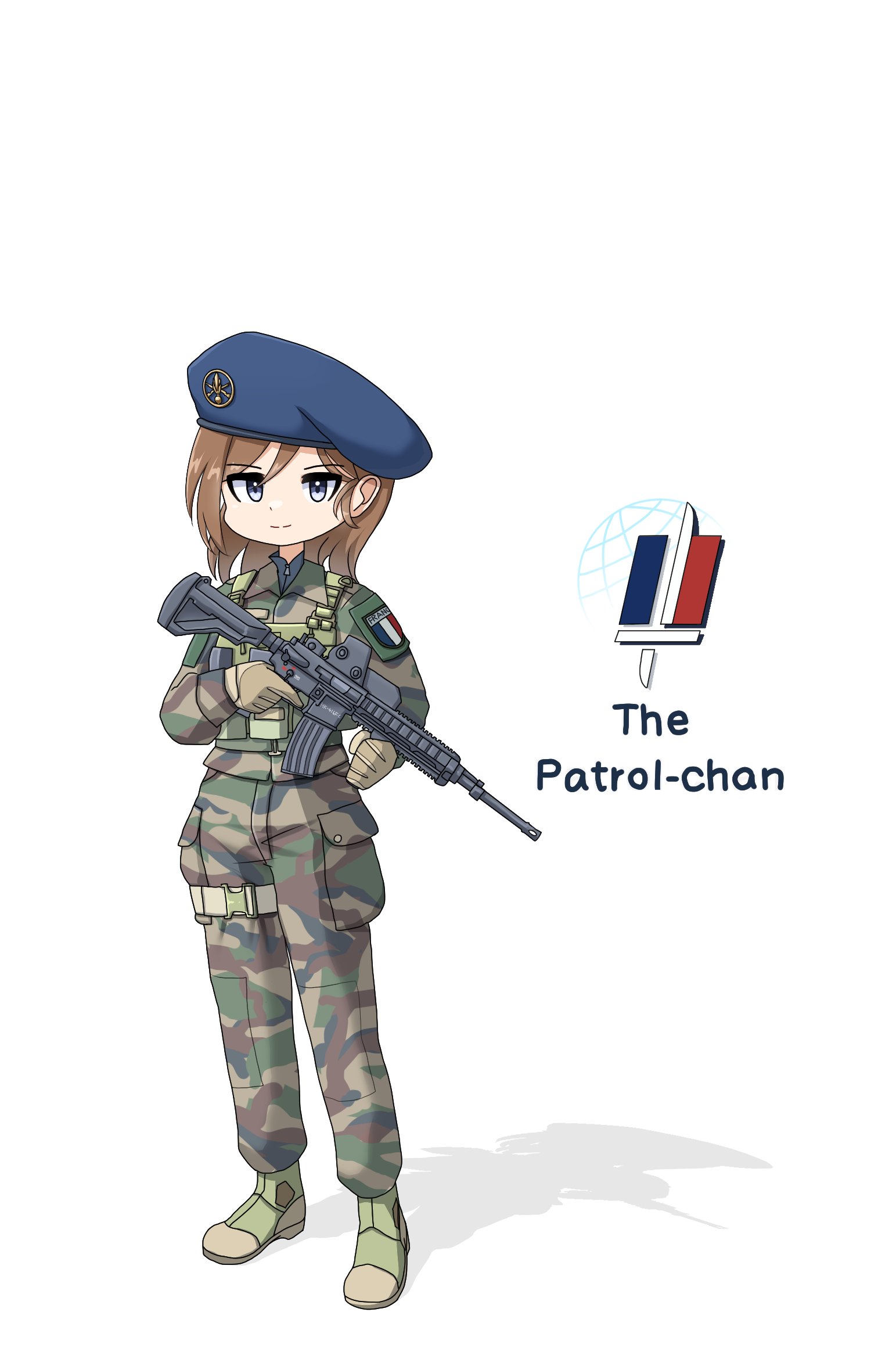 1girl ammunition_pouch assault_rifle badge belt beret blue_eyes boots brown_gloves brown_hair brown_shoes bulletproof_vest camouflage camouflage_jacket camouflage_pants character_name chest_rig closed_mouth commentary english_commentary english_text flag_patch france french_army french_flag full_body gloves gun h&k_hk416 hat highres holding holding_gun holding_weapon invisible_floor jacket leochan1202 long_sleeves looking_at_viewer medium_hair military_uniform original pants patch pouch real_life rifle shadow shoes shoulder_patch simple_background smile soldier solo standing tactical_vest two-handed weapon white_background