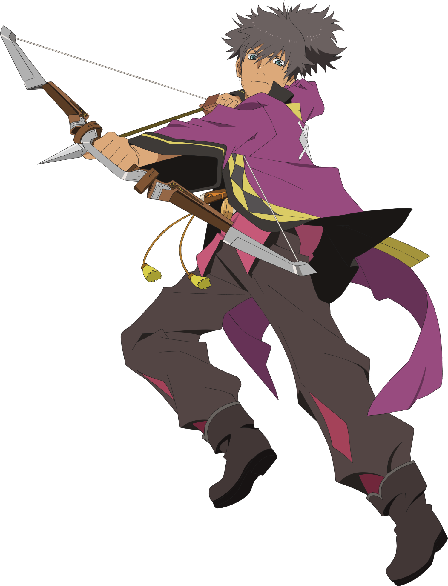 1boy artist_request black_boots black_hair black_pants boots bow_(weapon) closed_mouth coat commentary dark_skin facial_hair full_body game_cg green_eyes highres holding holding_bow_(weapon) holding_weapon long_hair looking_at_viewer male_focus official_art pants pink_shirt ponytail purple_coat raven_(tales) sheath sheathed shirt short_sword simple_background solo standing sword tales_of_(series) tales_of_asteria tales_of_vesperia third-party_source transparent_background weapon