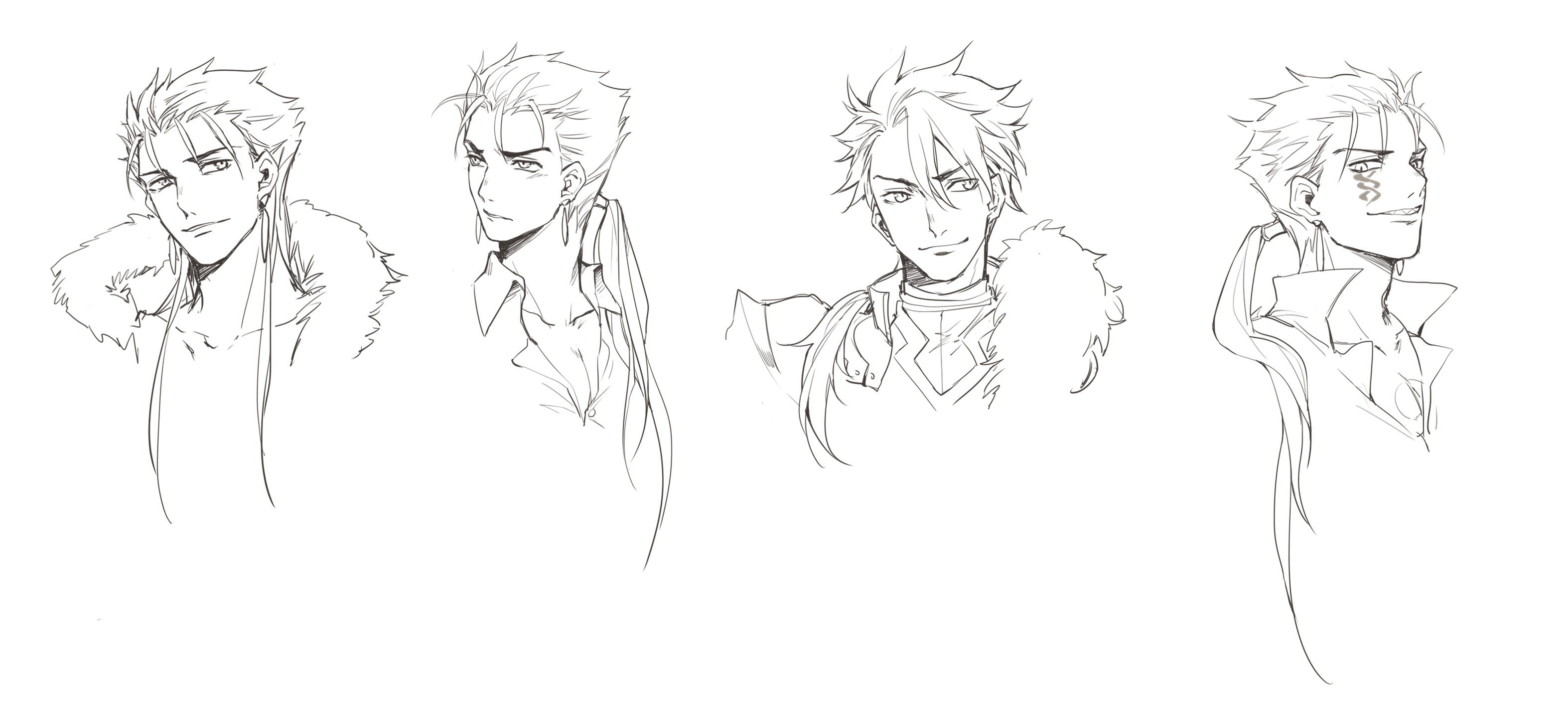 4boys closed_mouth cu_chulainn_(caster)_(fate) cu_chulainn_(fate) cu_chulainn_(fate/prototype) cu_chulainn_(fate/stay_night) cu_chulainn_(lancer)_(fate) cu_chulainn_alter_(fate) earrings expressionless fate/grand_order fate_(series) fur_scarf hair_tubes highres jewelry kuzen long_hair looking_to_the_side male_focus multiple_boys multiple_persona parted_hair popped_collar portrait sharp_teeth shirt sideways single_hair_tube smile smirk teeth