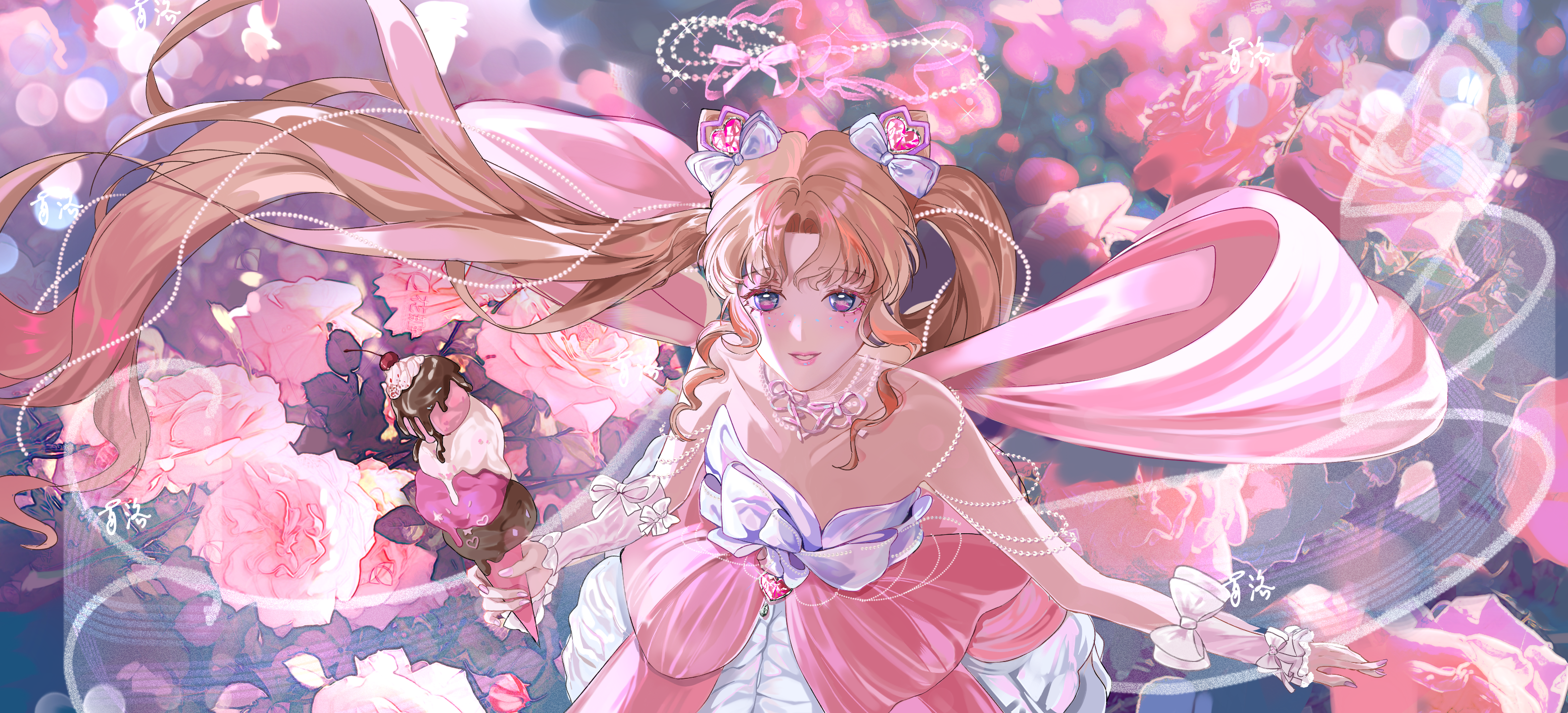 1girl arm_bow arm_warmers back_bow bead_armlet bead_necklace beads blonde_hair blue_eyes bow bow_in_eye cherry chinese_commentary chocolate_syrup commentary_request cone_hair_bun cowboy_shot double_bun dreamtime_bestowed_(infinity_nikki) dress dress_bow eyelashes field fingernails floating_hair flower flower_field food frilled_arm_warmers frills from_above fruit gem gem_hair_ornament hair_beads hair_bow hair_bun hair_ornament hair_ribbon halo happy heart-shaped_gem highres holding holding_food holding_ice_cream holding_ice_cream_cone ice_cream ice_cream_cone infinity_nikki jewelry large_bow layered_dress light_blush lipstick long_hair looking_at_viewer luo0956637 makeup neck_ribbon necklace nikki_(series) parted_bangs parted_lips pink_arm_warmers pink_bow pink_dress pink_flower pink_gem pink_lips pink_ribbon pink_rose ribbon rose sleeveless sleeveless_dress smile solo spaghetti_strap sprinkles standing strap_slip teeth twintails very_long_hair wavy_hair white_bow white_dress wind