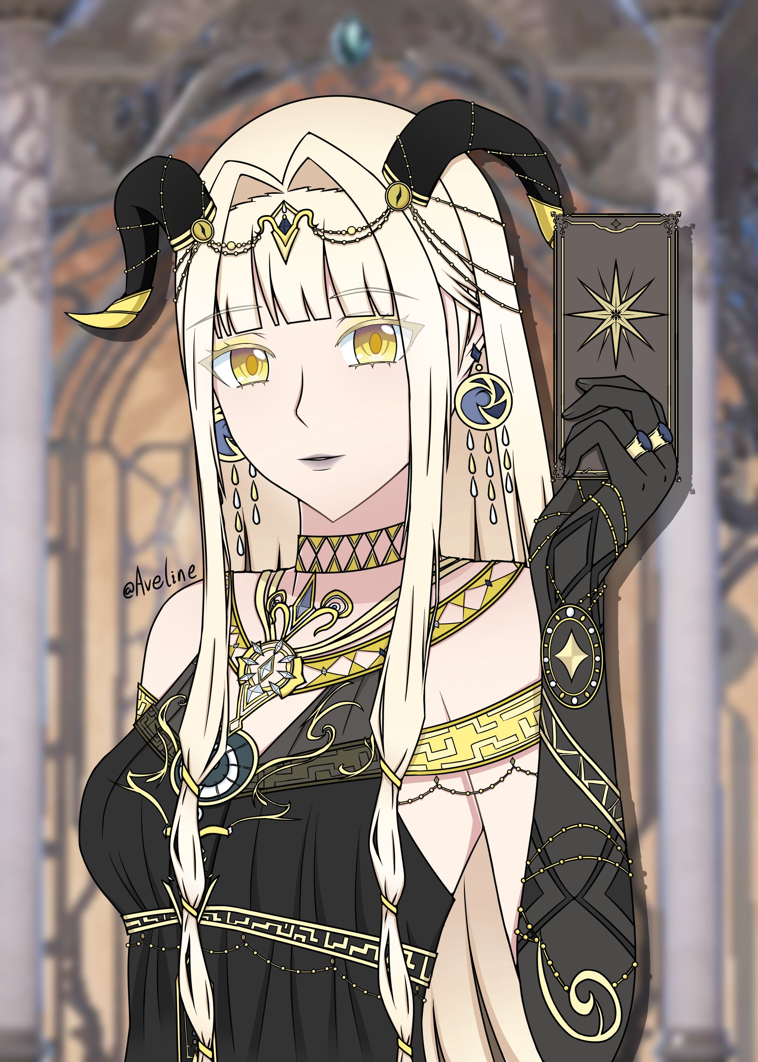 1girl absurdres anlingjiang argyle_choker black_dress black_gloves black_horns blonde_hair blurry blurry_background breasts card chinese_commentary choker colored_eyelashes commentary_request curled_horns dress earrings elbow_gloves expressionless eyes_visible_through_hair eyeshadow gloves goat_horns gold_necklace grey_lips hair_intakes hair_ribbon highres holding holding_card horns indoors infinity_nikki jewelry light_smile lipstick long_hair long_sidelocks makeup multi-tied_hair multiple_rings necklace night_capricorn_song_(infinity_nikki) nikki_(series) parted_lips ribbon ring sidelocks signature sleeveless sleeveless_dress solo straight_hair sunset tarot tarot_card tress_ribbon upper_body very_long_hair window yellow_choker yellow_eyes yellow_eyeshadow yellow_ribbon