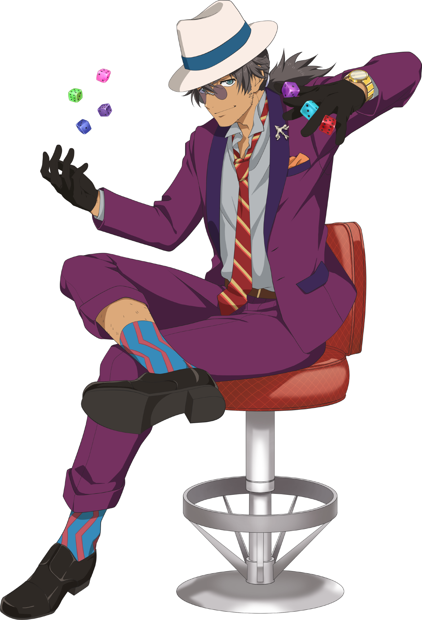 1boy artist_request black_gloves black_hair black_shoes blue_socks chair closed_mouth collarbone crossed_legs dark_skin dice facial_hair formal_clothes full_body game_cg gloves grey_shirt hat highres holding holding_dice long_hair looking_at_viewer male_focus necktie official_alternate_costume official_art on_chair pants pink_socks ponytail purple_pants purple_suit raven_(gambler)_(tales) raven_(tales) red_necktie shirt shoes simple_background sitting smile socks solo suit tales_of_(series) tales_of_asteria tales_of_vesperia third-party_source tinted_eyewear transparent_background two-tone_socks white_hat yellow_necktie