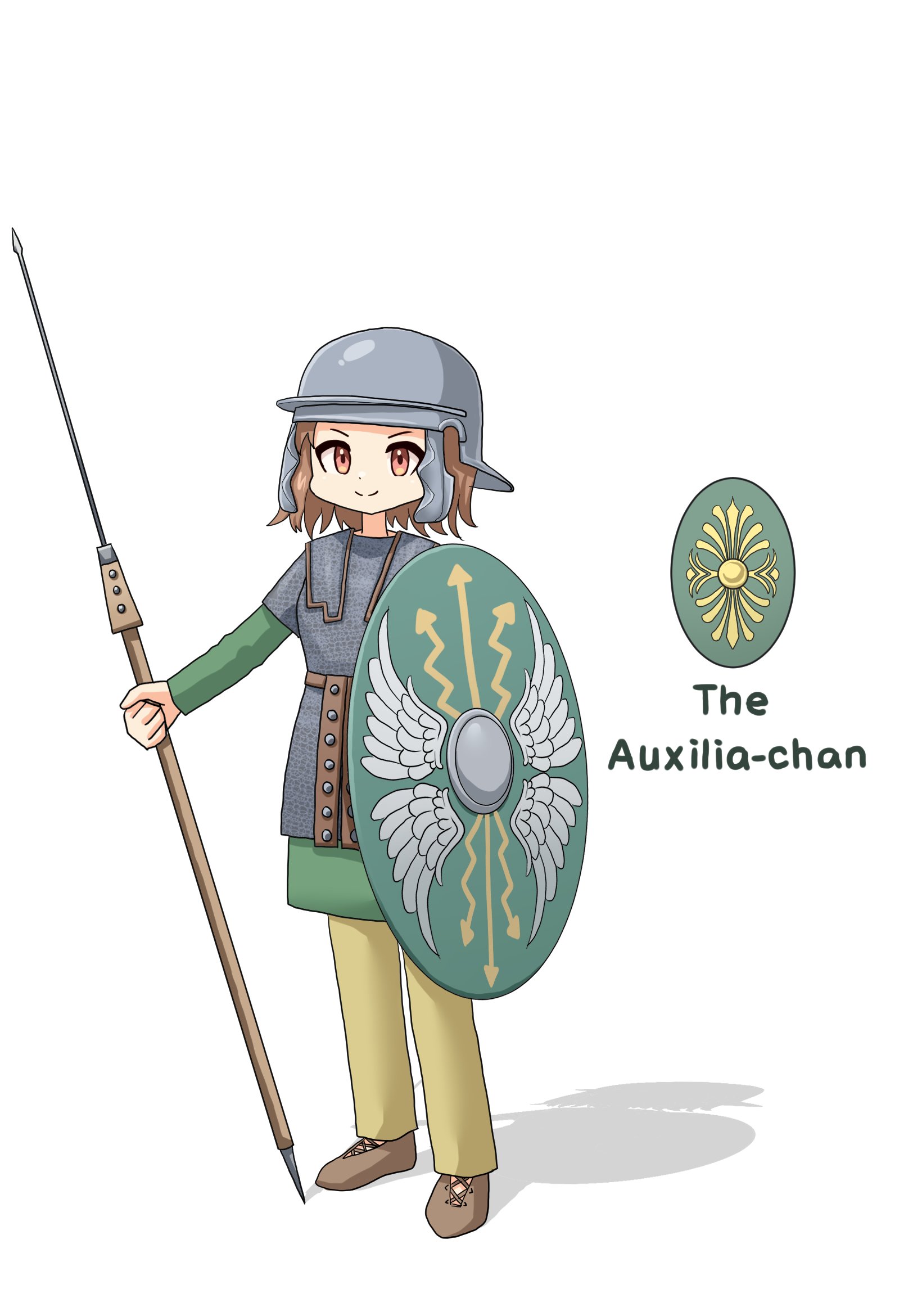 1girl armor belt brown_hair brown_shoes chainmail character_name cheek_guards closed_mouth english_text full_body green_tunic helmet highres holding holding_polearm holding_shield holding_weapon invisible_floor leochan1202 long_sleeves looking_at_viewer lorica_hamata medium_hair original pants polearm real_life red_eyes roman_empire sandals shadow shield shoes simple_background smile soldier solo spear standing tunic weapon white_background