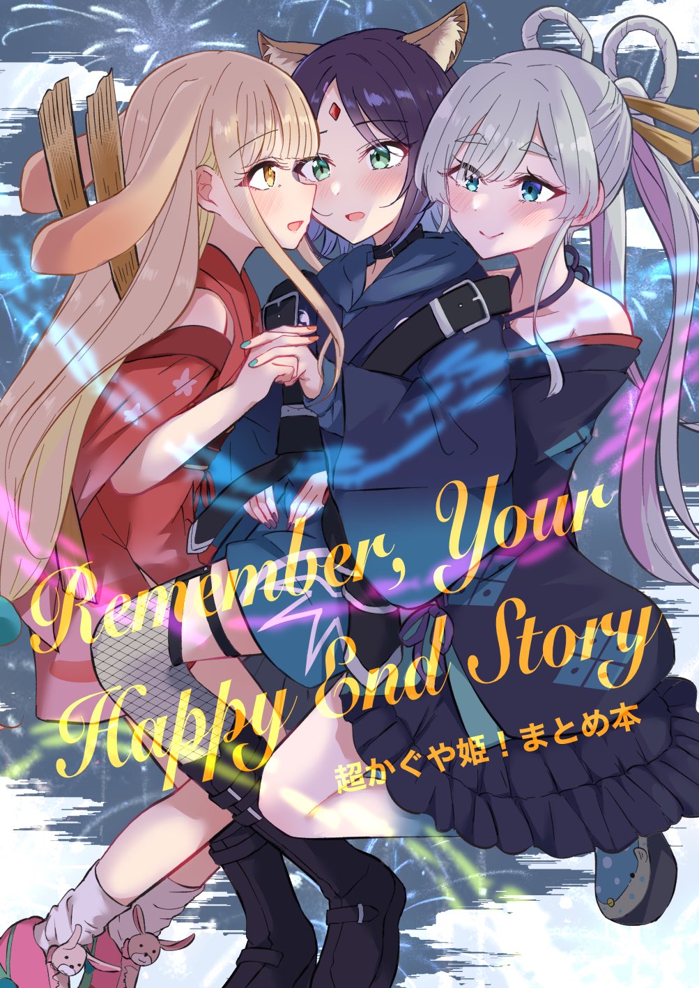3girls bare_shoulders black_choker black_hair blue_eyes blue_hair blue_hoodie blush cho_kaguya-hime! choker commentary_request cover cover_page english_text eye_contact face-to-face fireworks girl_sandwich green_eyes grey_hair hair_ornament hair_rings hair_stick halterneck highres hood hoodie kaguya_(cho_kaguya-hime!) long_hair looking_at_another multicolored_hair multiple_girls na_bia pink_hair runami_yachiyo sakayori_iroha sandwiched single_fishnet_legwear translated twintails two-tone_hair yuri