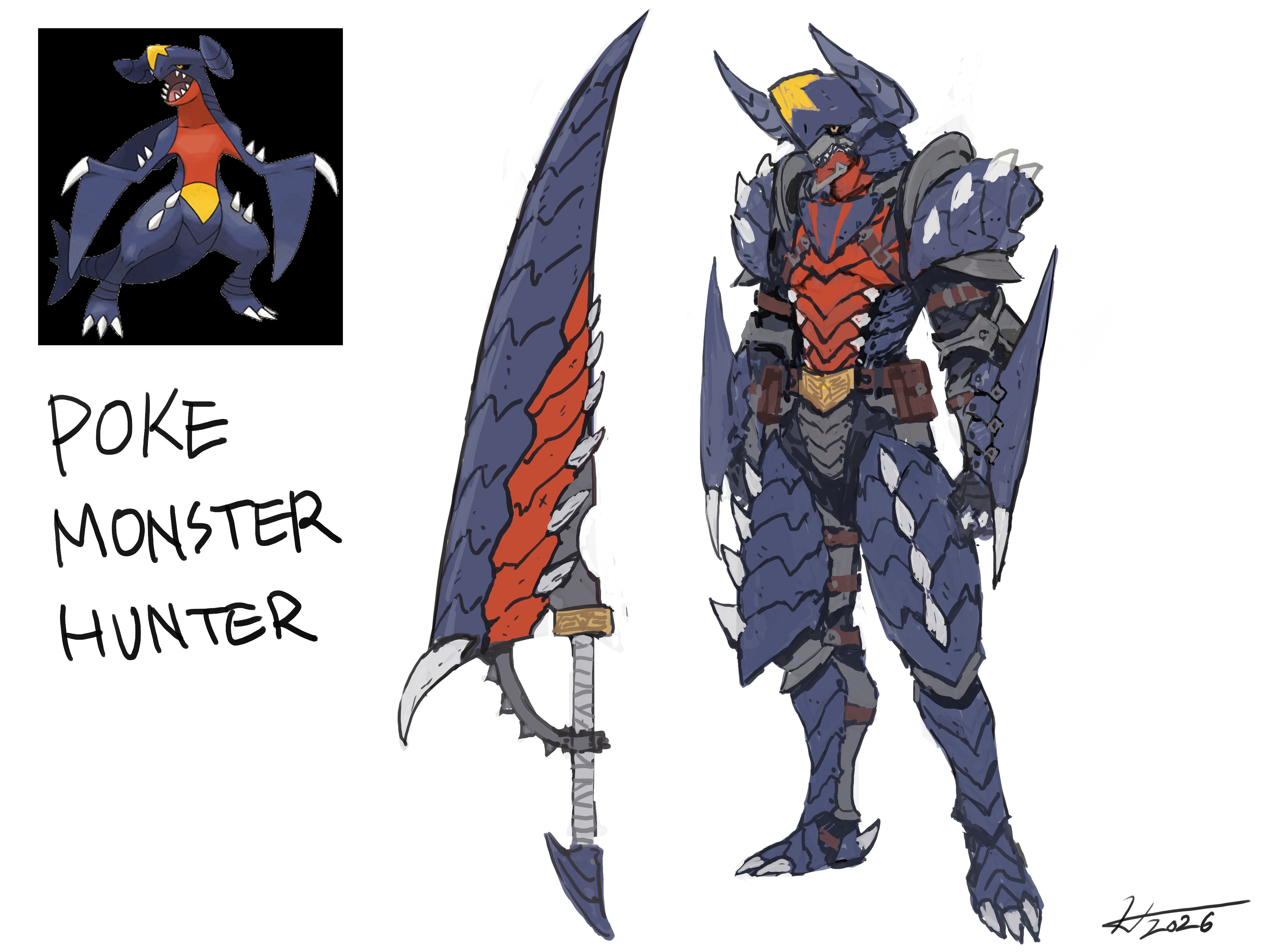 1boy absurdres black_sclera claws colored_sclera commentary dragon english_commentary garchomp gen_4_pokemon hichi highres huge_weapon humanoid_and_humanization male_focus monster_hunter_(series) nintendo pokemon pokemon_diamond/pearl/platinum pokemon_legends:_arceus pokemon_platinum sharp_teeth solo spikes sword teeth weapon