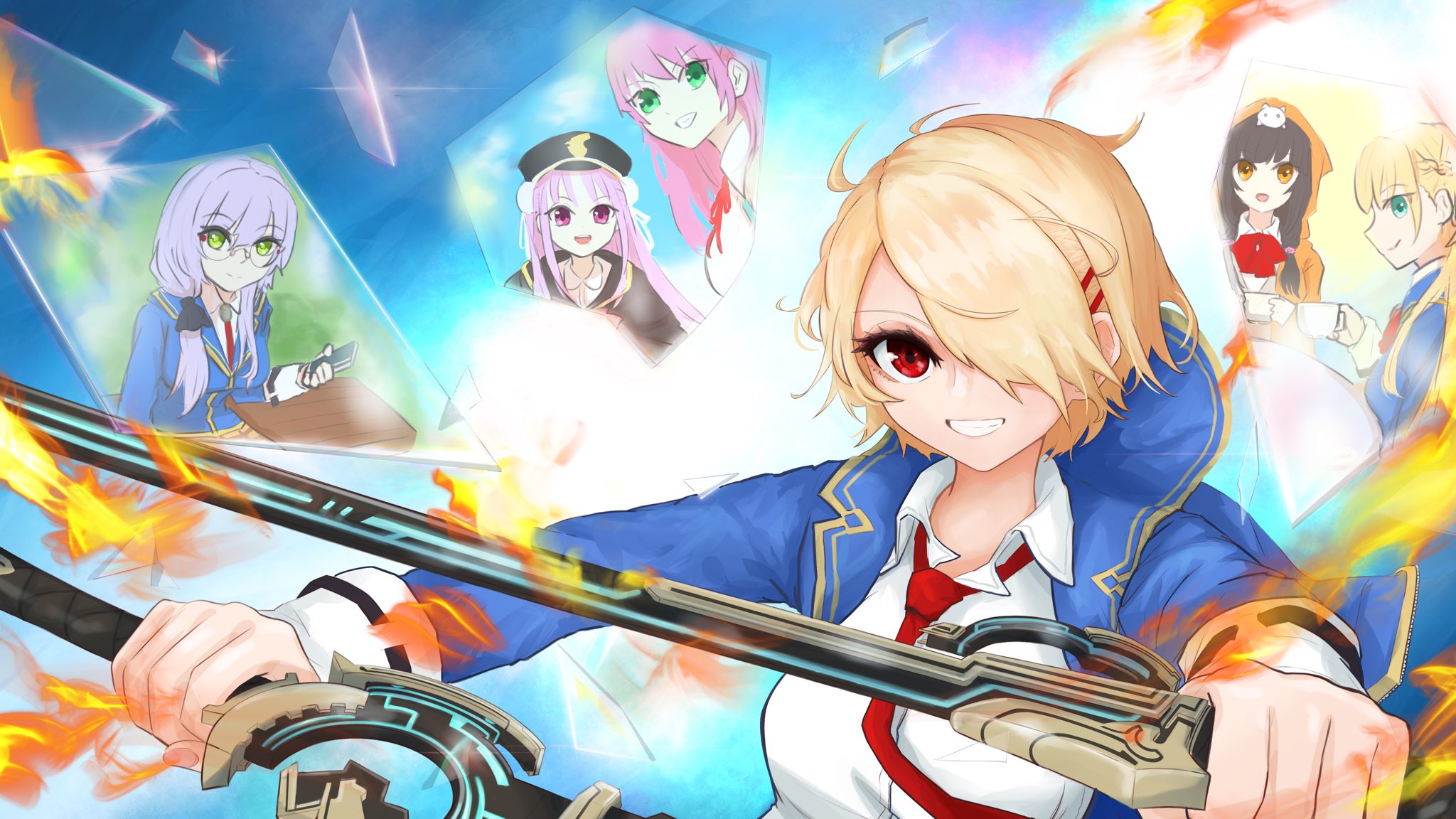1girl :d aikawa_megumi asakura_karen_(heaven_burns_red) blonde_hair blue_background blue_jacket broken_glass closed_mouth collared_shirt commentary_request dual_wielding eyelashes fighting_stance fire floating_hair glass glasses green_eyes grey_hair grin hair_ornament hair_over_one_eye hairclip heaven_burns_red highres holding holding_sword holding_weapon izumi_yuki jacket kayamori_ruka kunimi_tama long_bangs long_hair long_sleeves looking_at_viewer masumidashirasu necktie one_eye_covered open_clothes open_jacket open_mouth outstretched_arms parallel_hairclips pink_hair profile red_eyes red_necktie reflection round_eyewear shirt short_hair simple_background smile solo sword team_31a_(heaven_burns_red) toujou_tsukasa upper_body weapon white_shirt