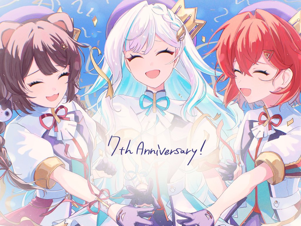3girls :d ^_^ ange_katrina animal_ears animal_hair_ornament anniversary beret blue_background blue_hair blue_ribbon braid brown_hair closed_eyes colored_inner_hair commentary_request confetti contrast_lapels crossed_bangs crown_hat_ornament dog_ears flower gloves group_picture hair_flower hair_intakes hair_ornament hat inui_toko jacket lapels lize_helesta long_hair low_twin_braids medium_hair multicolored_hair multiple_girls neck_ribbon nijisanji open_mouth outstretched_arm puffy_short_sleeves puffy_sleeves purple_gloves purple_hat purple_ribbon red_hair red_ribbon ribbon sakumoch_24 sanbaka_(nijisanji) sanbaka_anniversary_outfit short_sleeves single_hair_intake smile streaked_hair streamers triangle_hair_ornament twin_braids two-tone_hair very_long_hair virtual_youtuber white_hair white_jacket