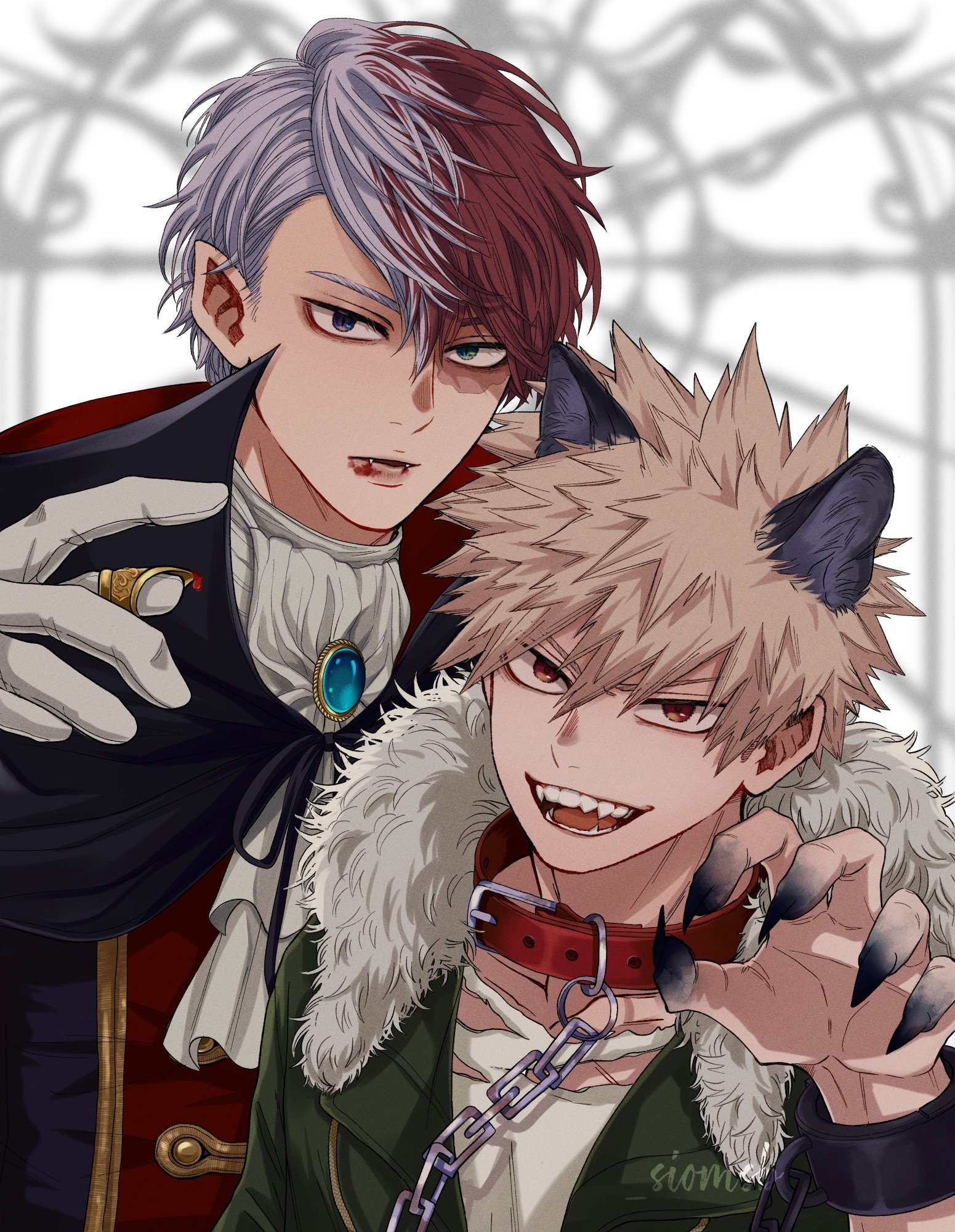 2boys animal_ears ascot bakugou_katsuki belt_collar black_cape blonde_hair blood blood_on_mouth blue_eyes boku_no_hero_academia brown_eyes burn_scar cape chain collar commentary_request fingernails fur-trimmed_collar fur_trim gloves green_jacket hair_between_eyes halloween_costume heterochromia highres jacket kemonomimi_mode looking_at_viewer male_focus multicolored_hair multiple_boys mystical_high_collar official_alternate_costume open_clothes open_jacket parted_hair pointy_ears red_cape red_collar red_eyes red_hair salt_-_siomsb scar scar_on_face sharp_fingernails sharp_teeth short_hair smile spiked_hair split-color_hair teeth todoroki_shoto two-sided_cape two-sided_fabric upper_body vampire werewolf white_ascot white_fur white_gloves white_hair wolf_boy wolf_ears