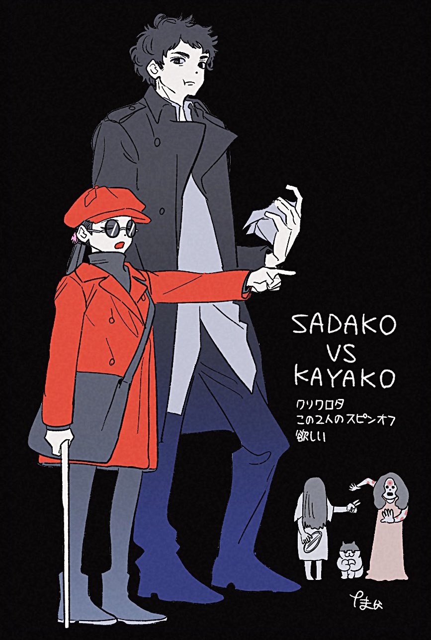 1boy 3girls arm_up artist_self-insert bag black_background black_bag black_eyes black_hair black_pants black_shoes cane closed_mouth commentary_request hat highres jacket long_sleeves multiple_girls newsboy_cap open_mouth pants pointing red_hat red_jacket sadako_vs._kayako saeki_kayako shoes simple_background tama_launcher tamao_(sadako_vs._kayako) the_grudge the_ring tokiwa_keizou_(sadako_vs._kayako) translation_request yamamura_sadako