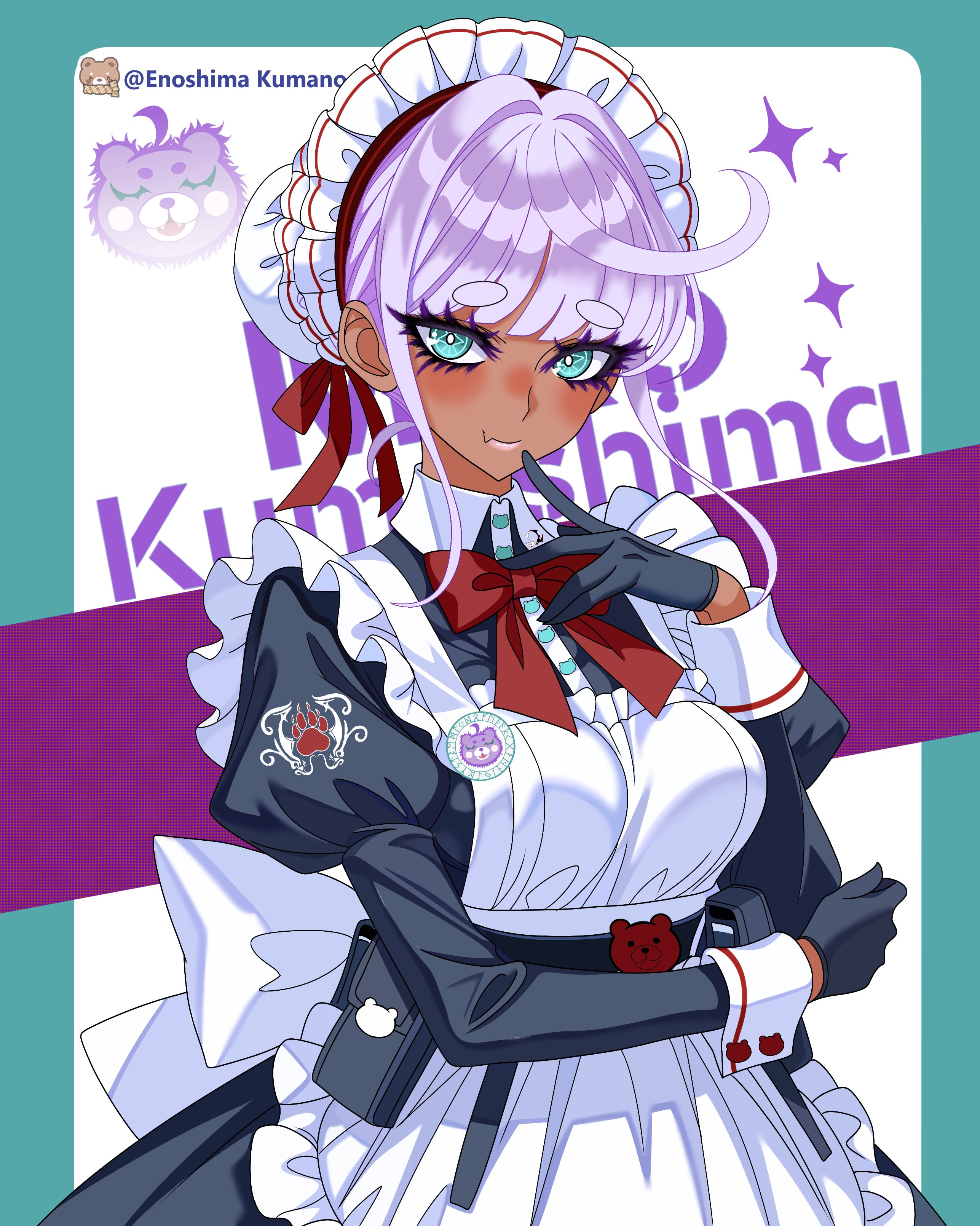 1girl absurdres alternate_skin_color apron black_gloves blush breasts danganronpa:_trigger_happy_havoc danganronpa_(series) dark-skinned_female dark_skin dress enoshima_abrian frilled_apron frills gloves highres kirigiri_kyoko large_breasts long_hair looking_at_viewer maid maid_apron maid_headdress short_hair smile solo white_apron