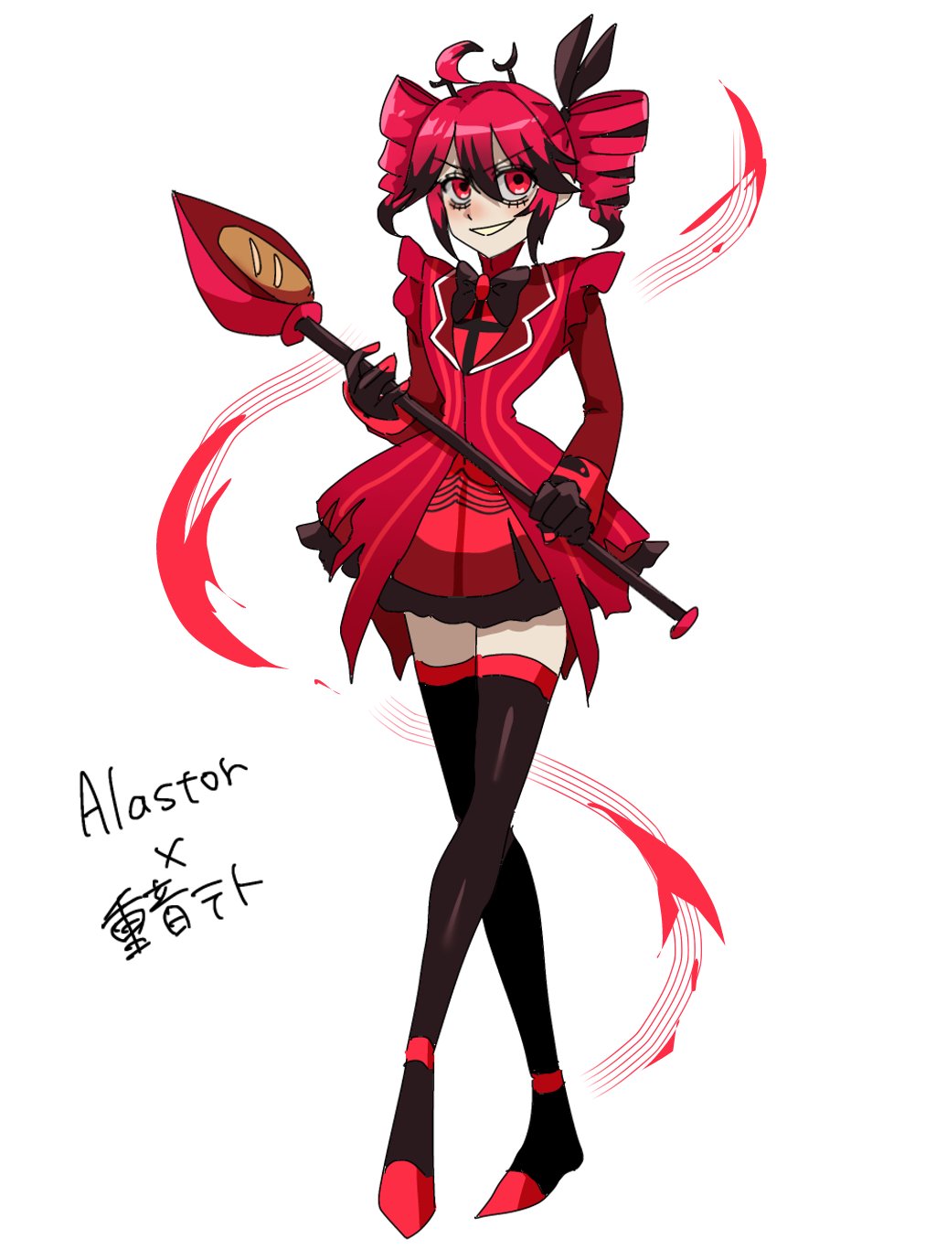 1girl adapted_costume ahoge alastor_(hazbin_hotel) alastor_(hazbin_hotel)_(cosplay) antlers bags_under_eyes baguette black_boots black_bow black_bowtie black_gloves black_hair black_ribbon black_streaks black_trim blush boots bow bowtie bread brooch character_name commentary cosplay crossed_legs crossover deer_antlers dress drill_hair evil_smile eyelashes food frilled_dress frills full_body gloves grin hair_ribbon hazbin_hotel hellaverse highres holding holding_staff horns jewelry kasane_teto kasane_teto_(sv) long_sleeves looking_at_viewer manon0127 multicolored_hair pale_skin parted_lips red_aura red_dress red_eyes red_hair red_trim ribbon sidelocks simple_background smile solo staff standing streaked_hair striped_clothes striped_dress swirl synthesizer_v thigh_boots thighhighs twin_drills two-tone_hair v-shaped_eyebrows vertical-striped_clothes vertical-striped_dress white_background zettai_ryouiki