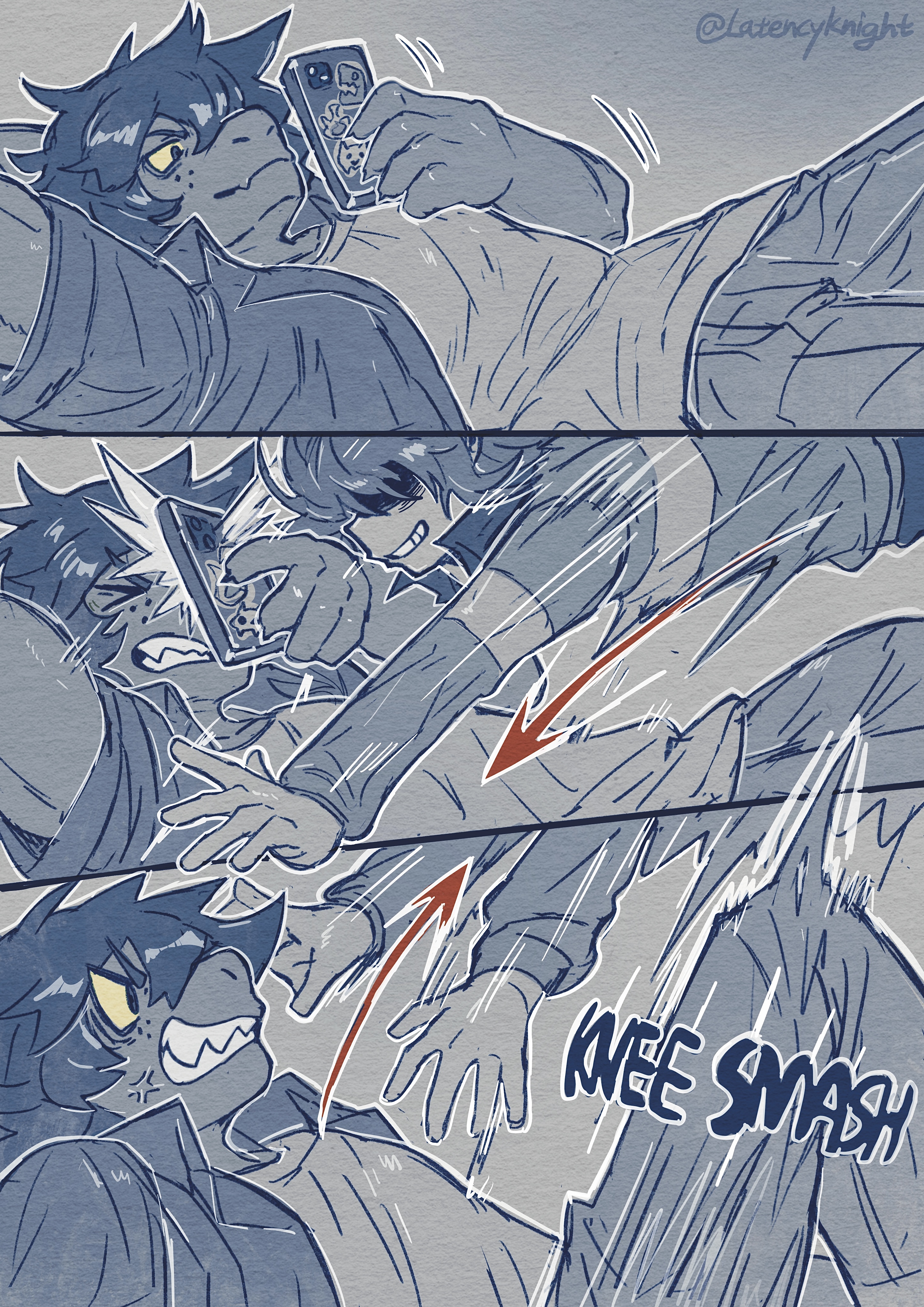 1girl 1other absurdres androgynous arrow_(symbol) artist_name blue_theme cellphone clenched_teeth closed_eyes collared_jacket colored_sclera commentary deltarune english_commentary english_text fangs furry furry_female grin highres holding holding_phone jacket kneeing kris_(deltarune) latencyknight long_sleeves looking_at_another lying monochrome on_back open_clothes open_jacket open_mouth pants phone shaded_face sharp_teeth shirt shirt_under_sweater short-sleeved_jacket short_sleeves skin_fangs smartphone smile spot_color susie_(deltarune) sweater t-shirt teeth twitter_username utdr_(toby_fox) yellow_sclera