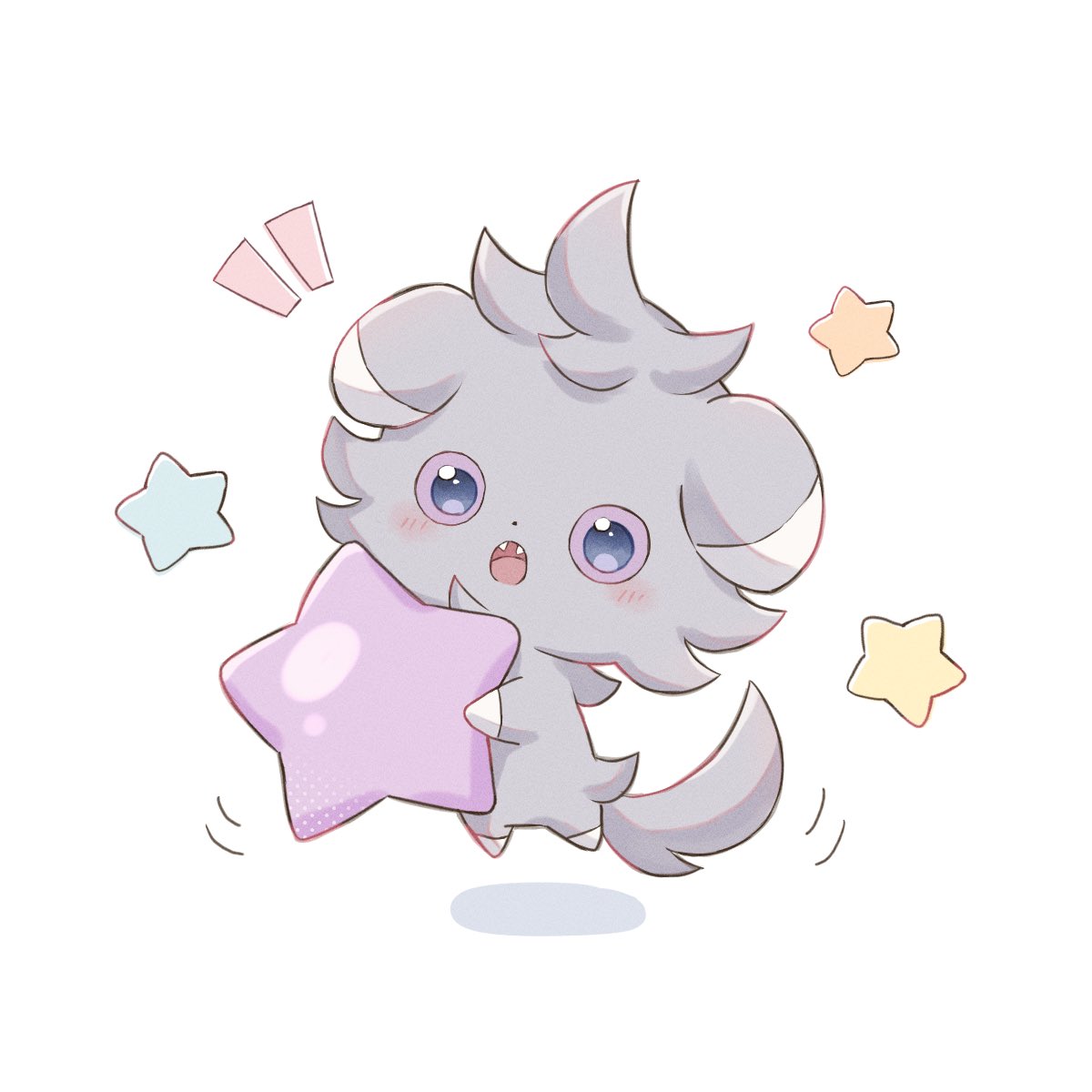 blush colored_sclera commentary_request espurr fangs gen_6_pokemon grey_fur highres holding holding_star jumping looking_at_viewer motion_lines nintendo nita_(02ta_o) no_humans notice_lines open_mouth pokemon pokemon_(creature) purple_eyes purple_sclera simple_background star_(symbol) tail tail_wagging white_background