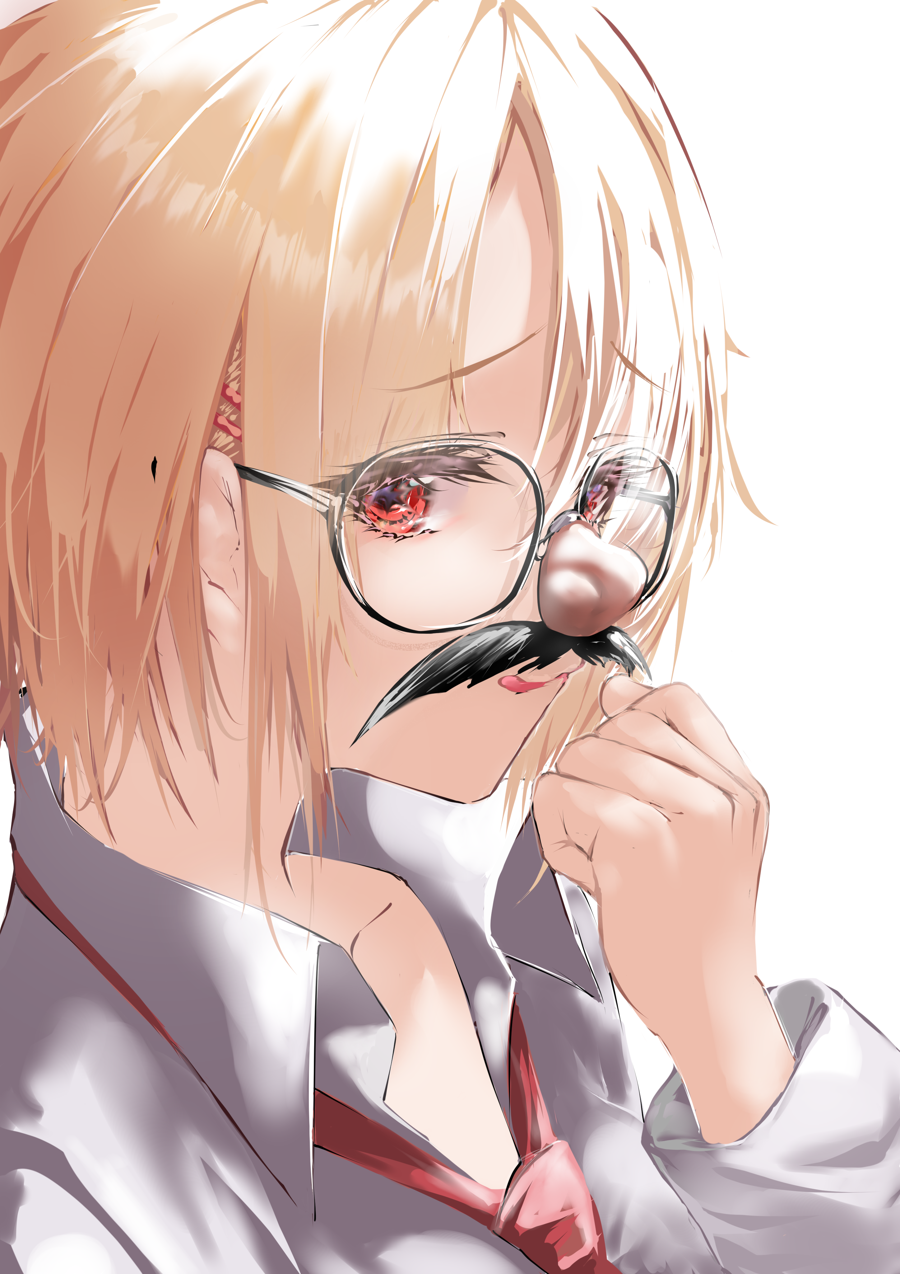 1girl :q absurdres blonde_hair clenched_hand closed_mouth collared_shirt commentary eyelashes eyes_visible_through_hair fake_facial_hair fake_mustache furrowed_brow fuuka_koji glasses groucho_glasses hair_ornament hair_over_one_eye hairclip hairpin hand_up heaven_burns_red highres kayamori_ruka long_bangs necktie nose parallel_hairclips portrait red_eyes red_necktie round_eyewear shirt short_hair simple_background smile solo teheperinko_(heaven_burns_red) tehepero tongue tongue_out white_background white_shirt